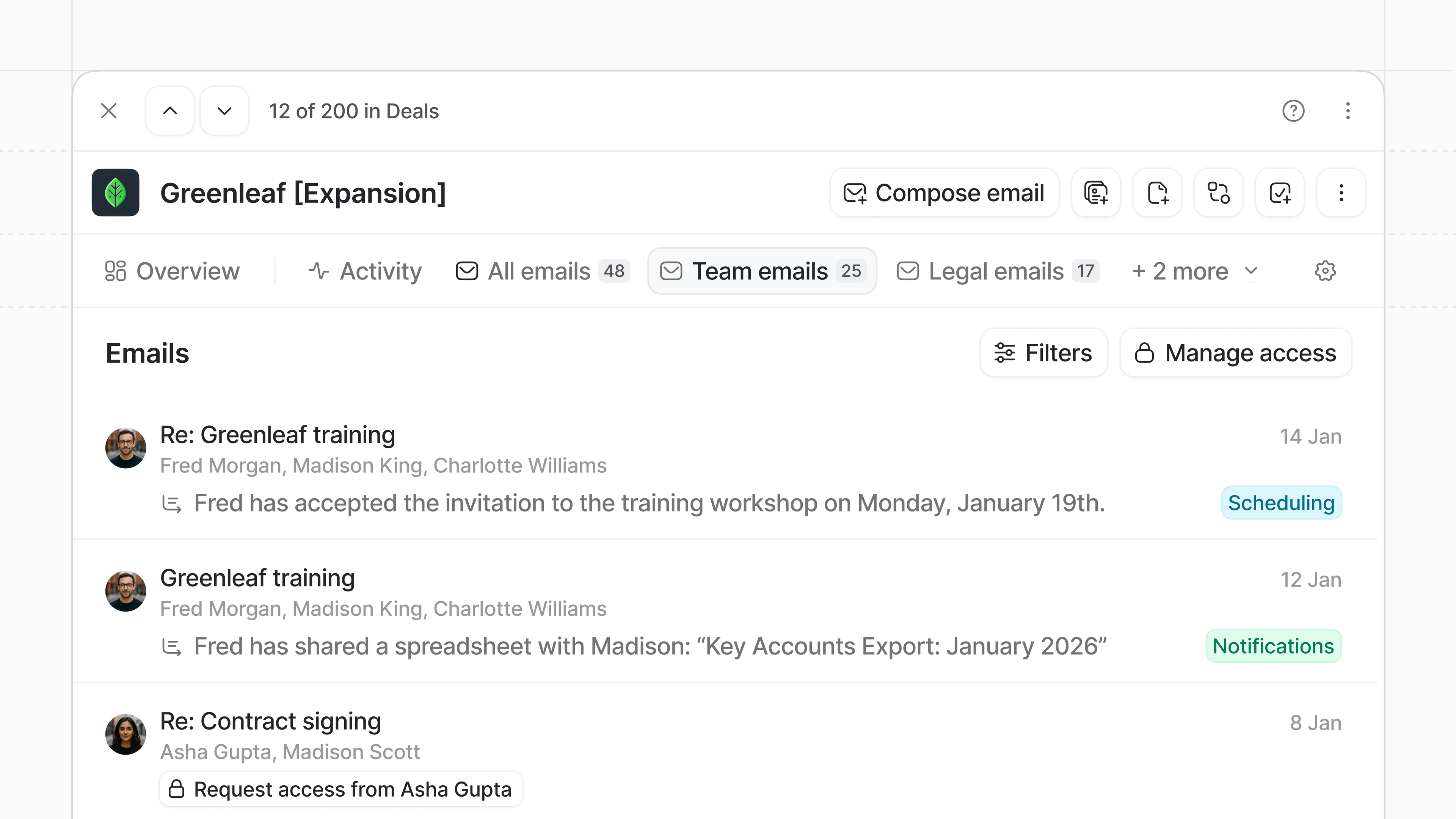 Plus, configure multiple tabs per object to organize communication your way. For example, on a Deal record, one tab can show all company emails, while another focuses on a specific legal contact.