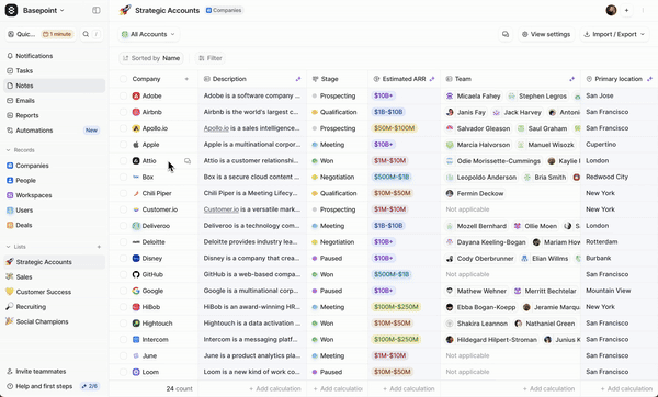 For example, you can make a list of Companies for partnership outreach, and then drill-down to email your chosen points of contact directly from this list.