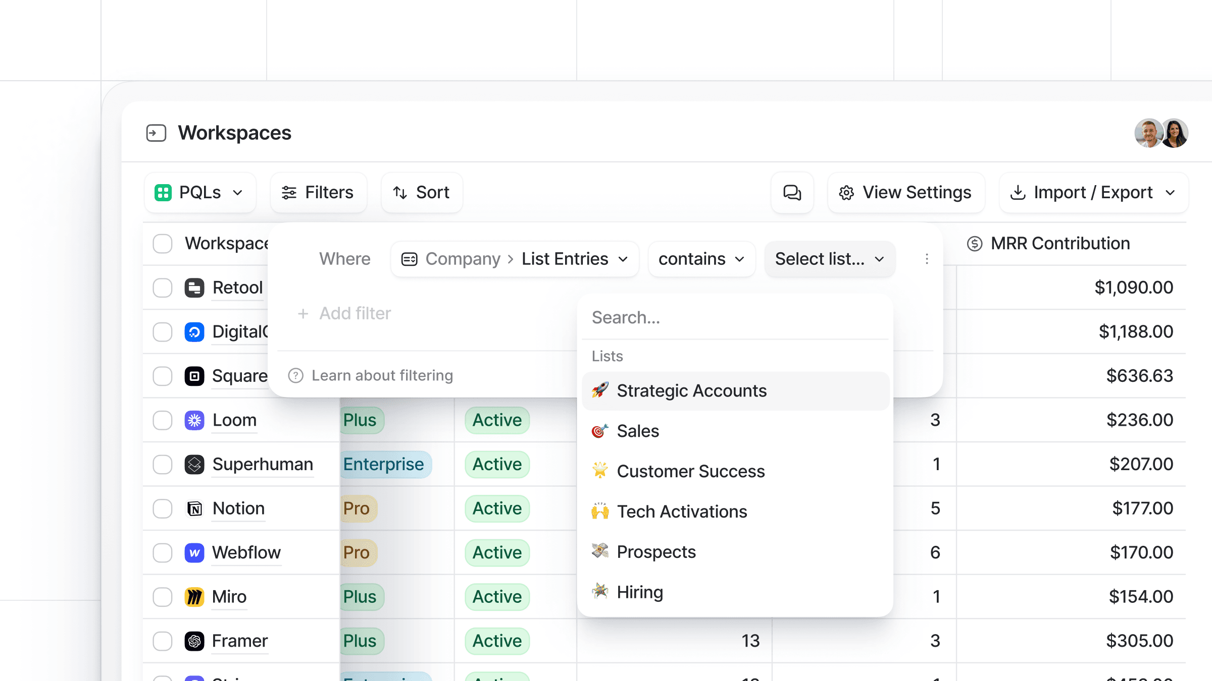 You can now filter records by their inclusion in any list in your Attio workspace. We also support the inverse filter, meaning you can filter for records not in a list
