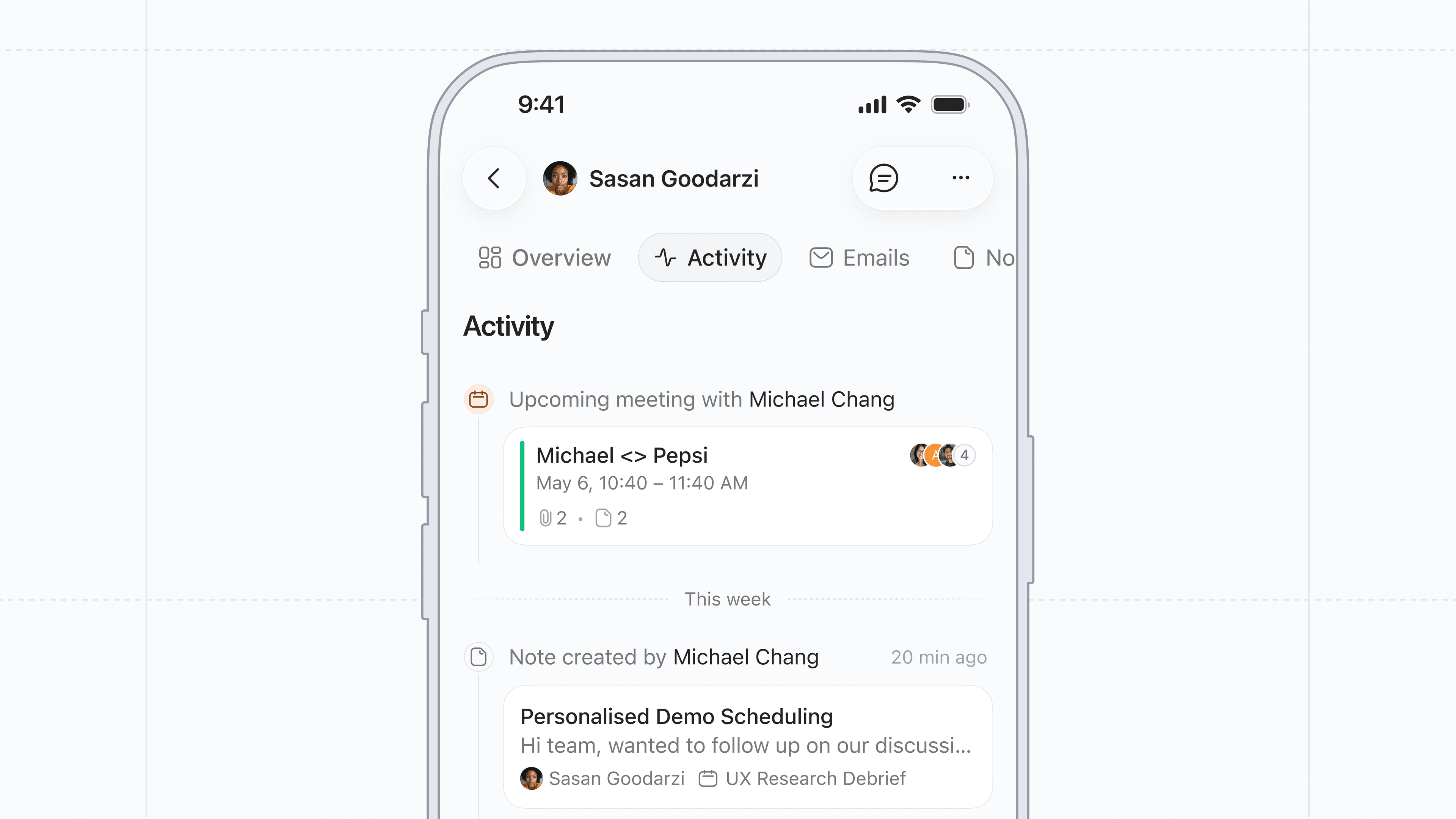 The new Activity tab in the Attio mobile app shows every significant event on a record — notes added, meetings scheduled, attributes updated, first connections made — so you can get up to speed before a call or follow-up without opening a browser.