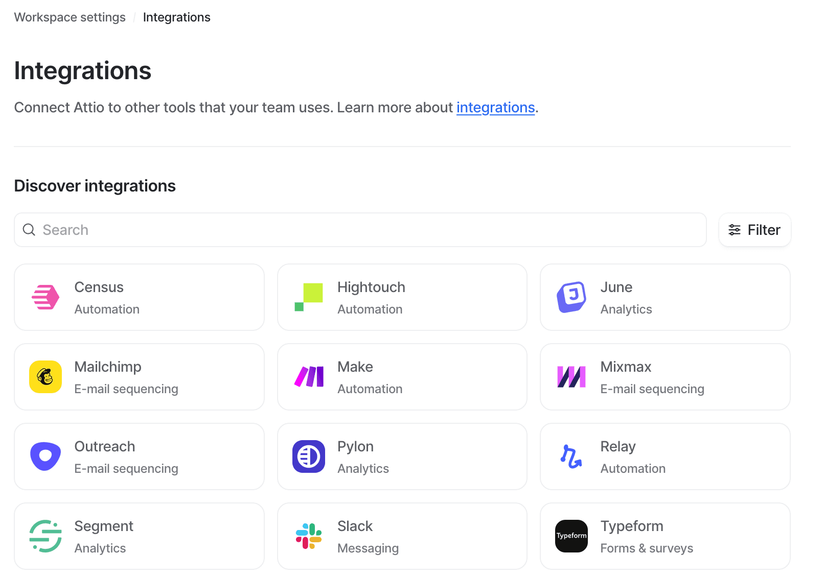 We’ve built out a new integrations portal where you can view your current integrations and explore others available in Attio, searchable by name or category.