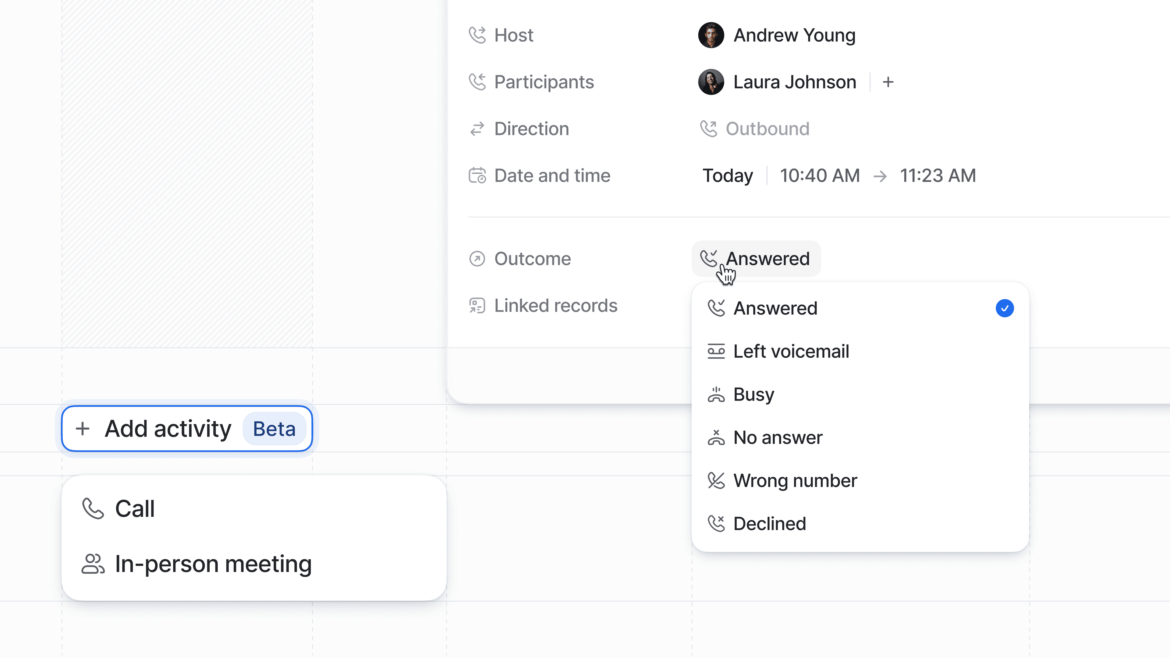 You can populate each activity with further details, including a Title, Summary, Host, Participants, Date and time, and more. We also automatically detect if you’re reaching out or being contacted, ensuring you have all the data you need about every interaction.