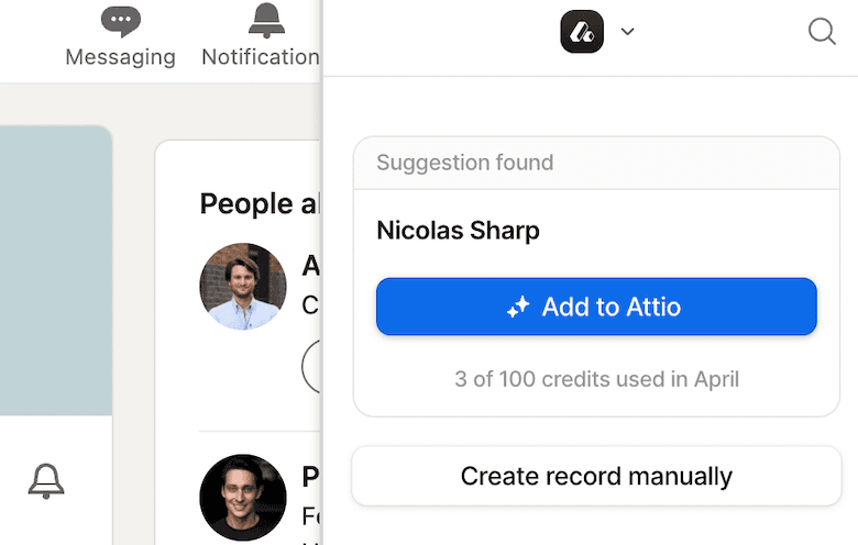 Our updated Chrome extension allows you to turn LinkedIn profiles (people and companies) into data-enriched records with a single click. Details from the page plus from our enriched data sources will create a detailed record in Attio in just a few seconds.