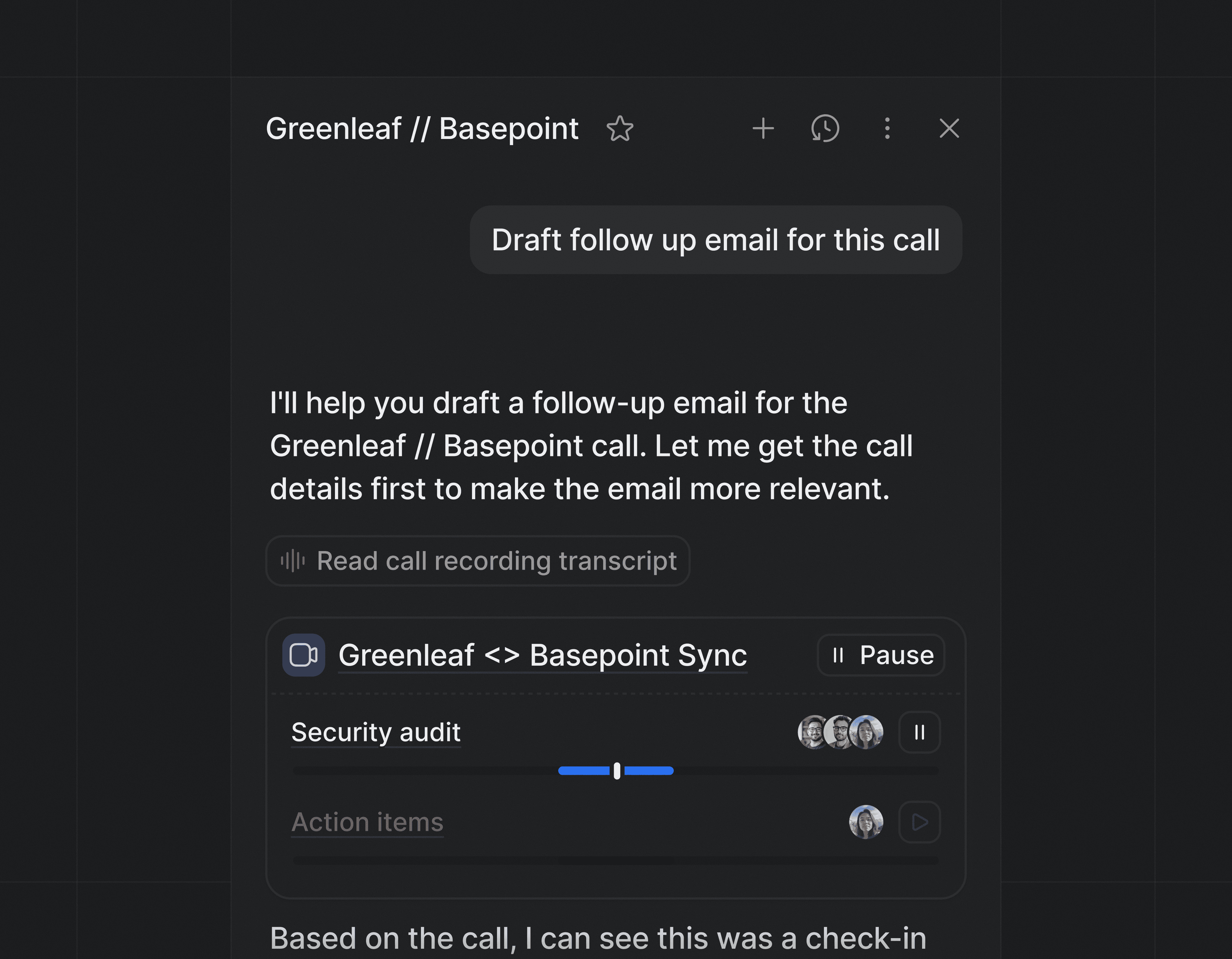 This allows Ask Attio to surface interactive elements directly in the conversation - including record cards, suggested follow-ups, call recording snippets with an inline audio player, and live indicators such as mailbox sync status - while the response is still streaming.
