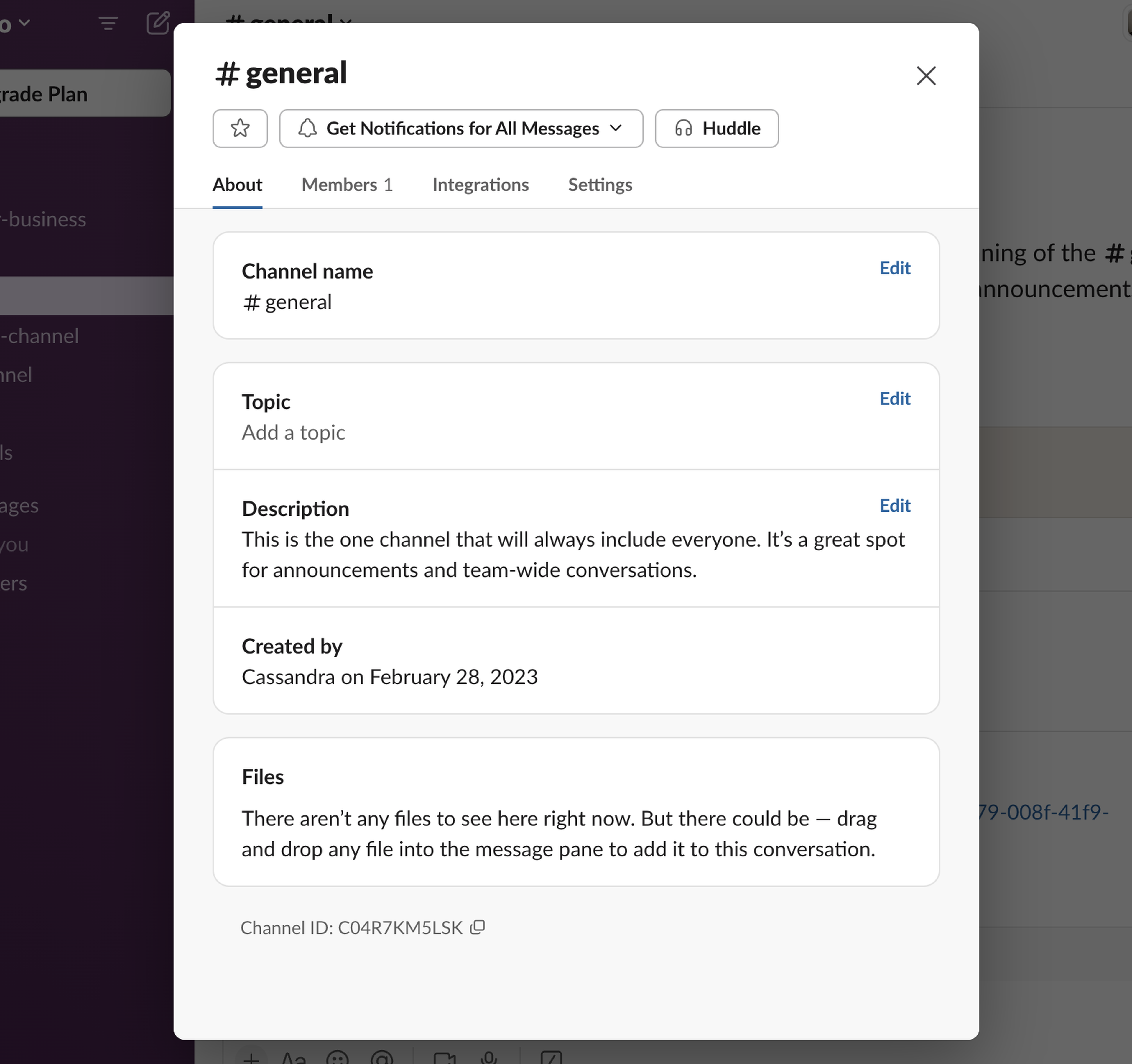 If you are prompted to enter the Slack ID for a channel manually, open Slack and navigate to the channel, click the channel name at the top, then scroll to the bottom of the About tab to find the Channel ID. Click the icon to its right to copy the ID.
