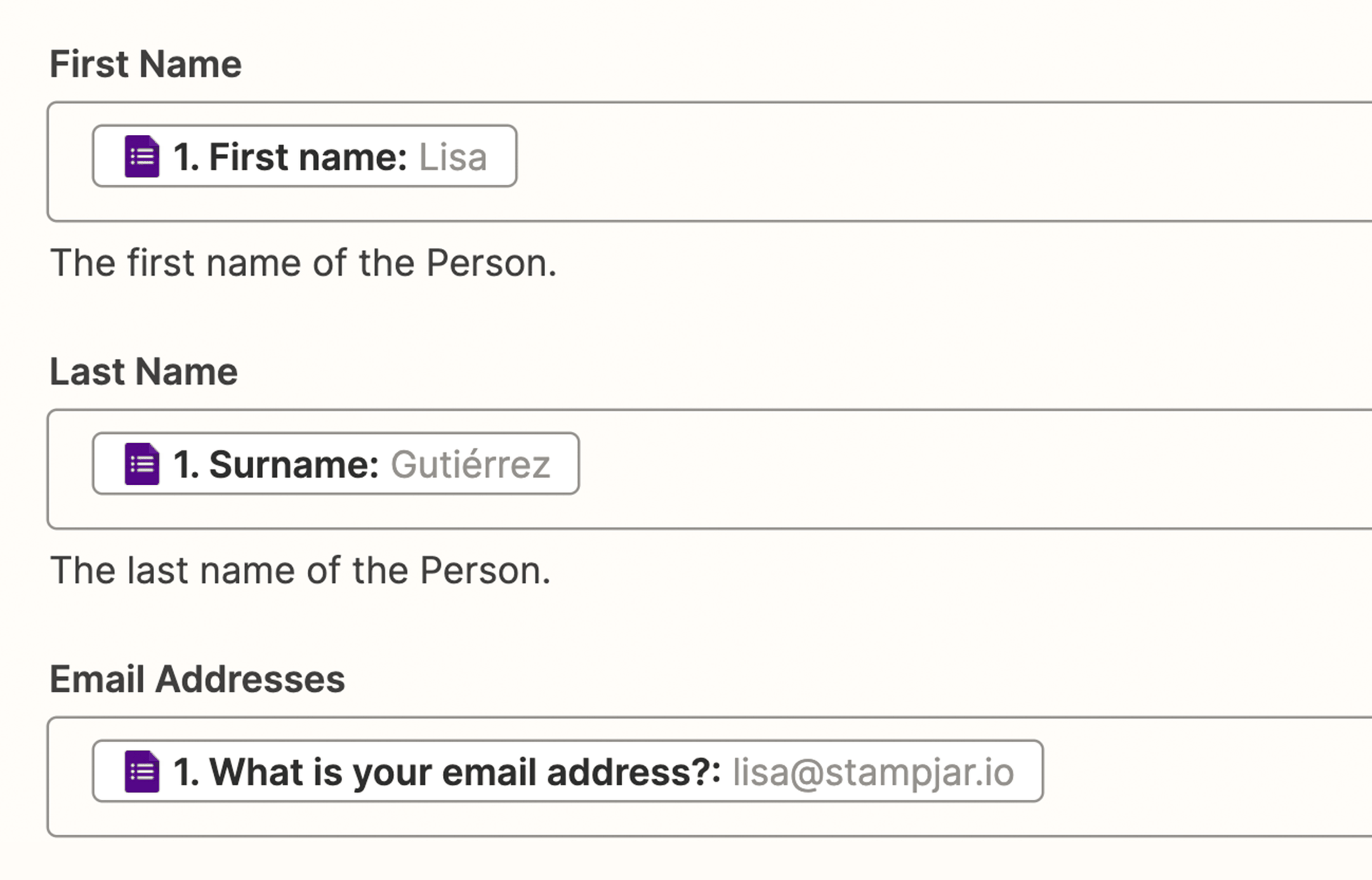 In the example below, we've input fields using data (name and email) from step 1 in the Zap.