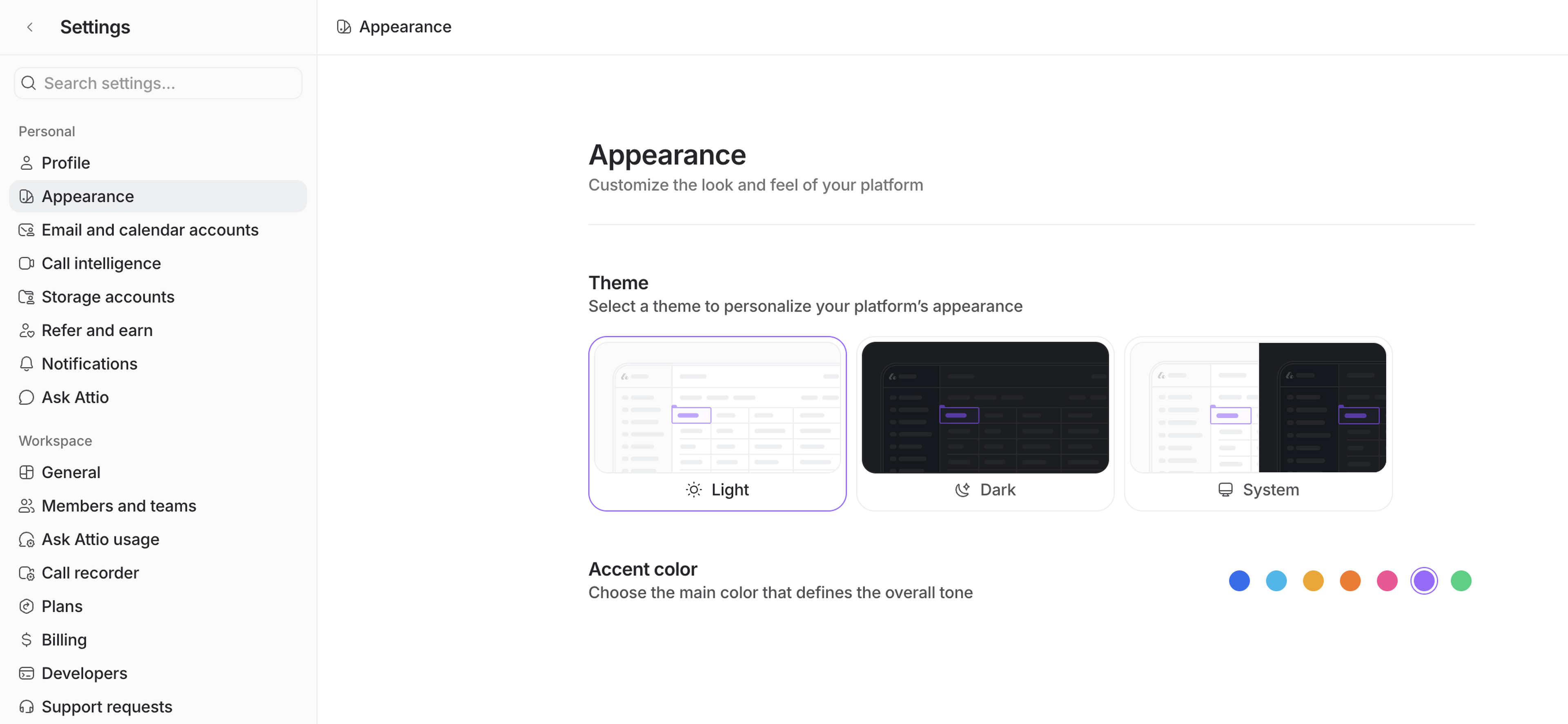 You can customize Attio’s appearance to match your preferences. Choose between light and dark themes and select an accent color to personalize your interface.