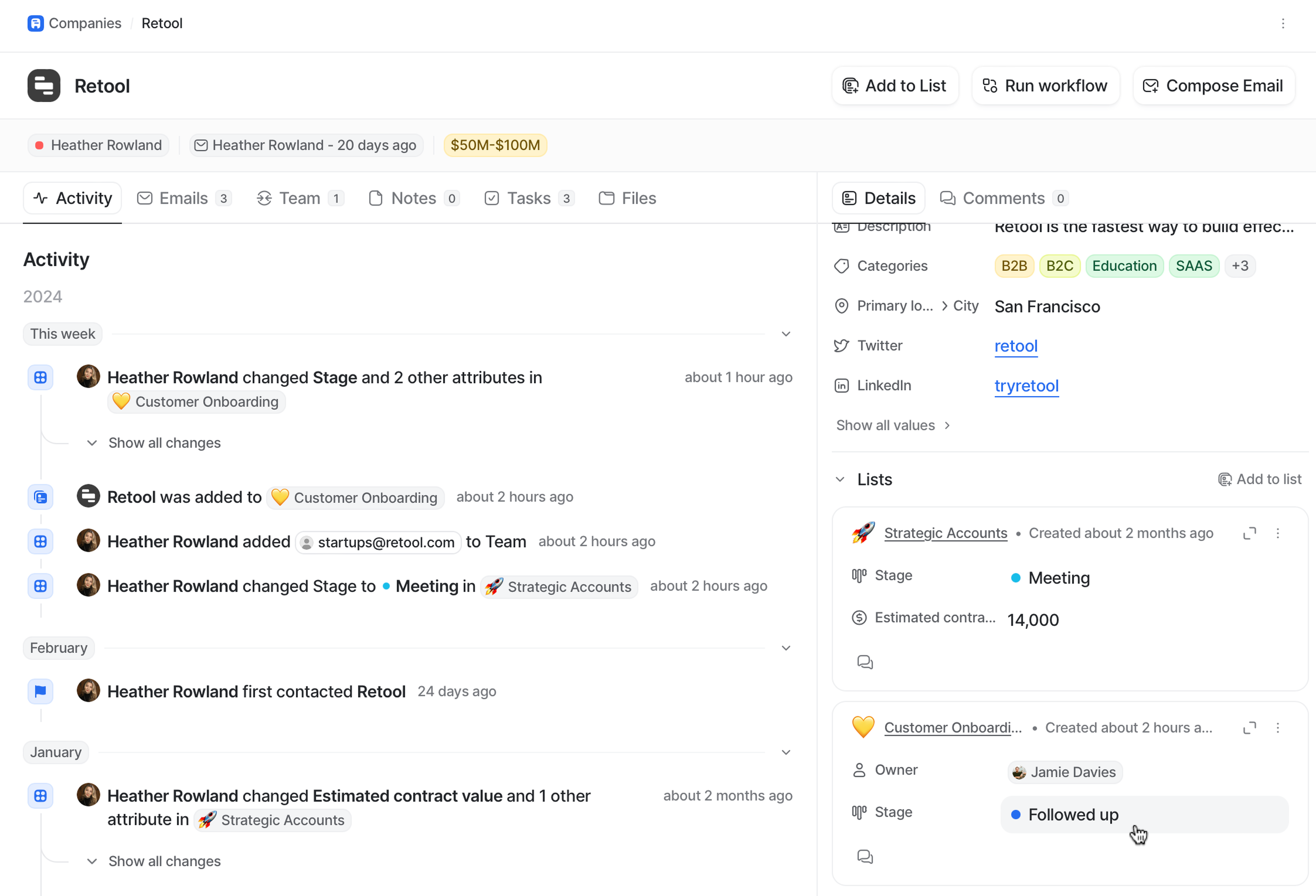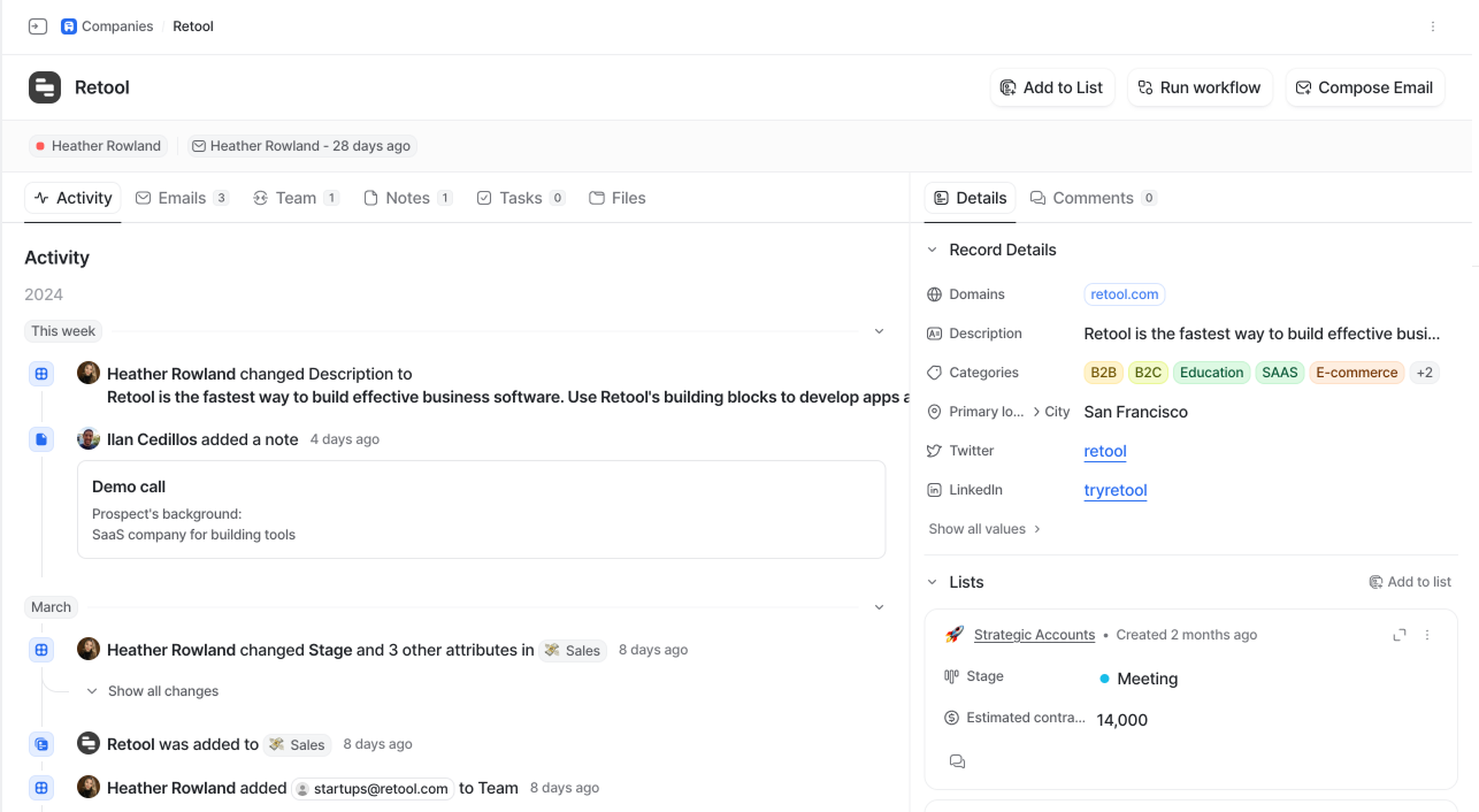 Attio models your data. It allows you to organize, structure, and connect it in whichever way that suits your business, and then use your data to build business workflows and processes.