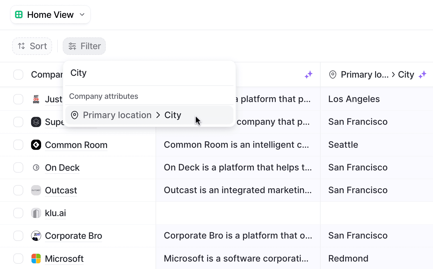 From there, we can quickly filter and sort through our records any which way. For example, let’s say we want to figure out which companies are based in San Francisco and have an estimated ARR of $100m-$500m.