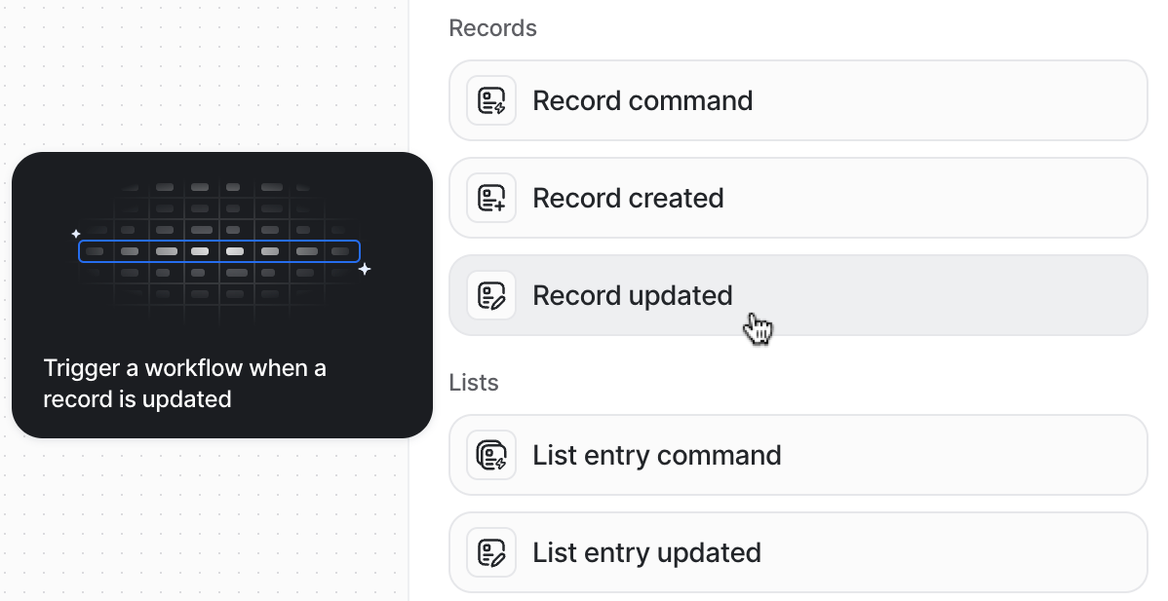 There are six types of trigger blocks in Attio: Records, Lists, Data, Tasks, Utilities and Integrations. We won’t go over them all here, but you can hover over each block to get an explanation of each one or check out the article in our help center.