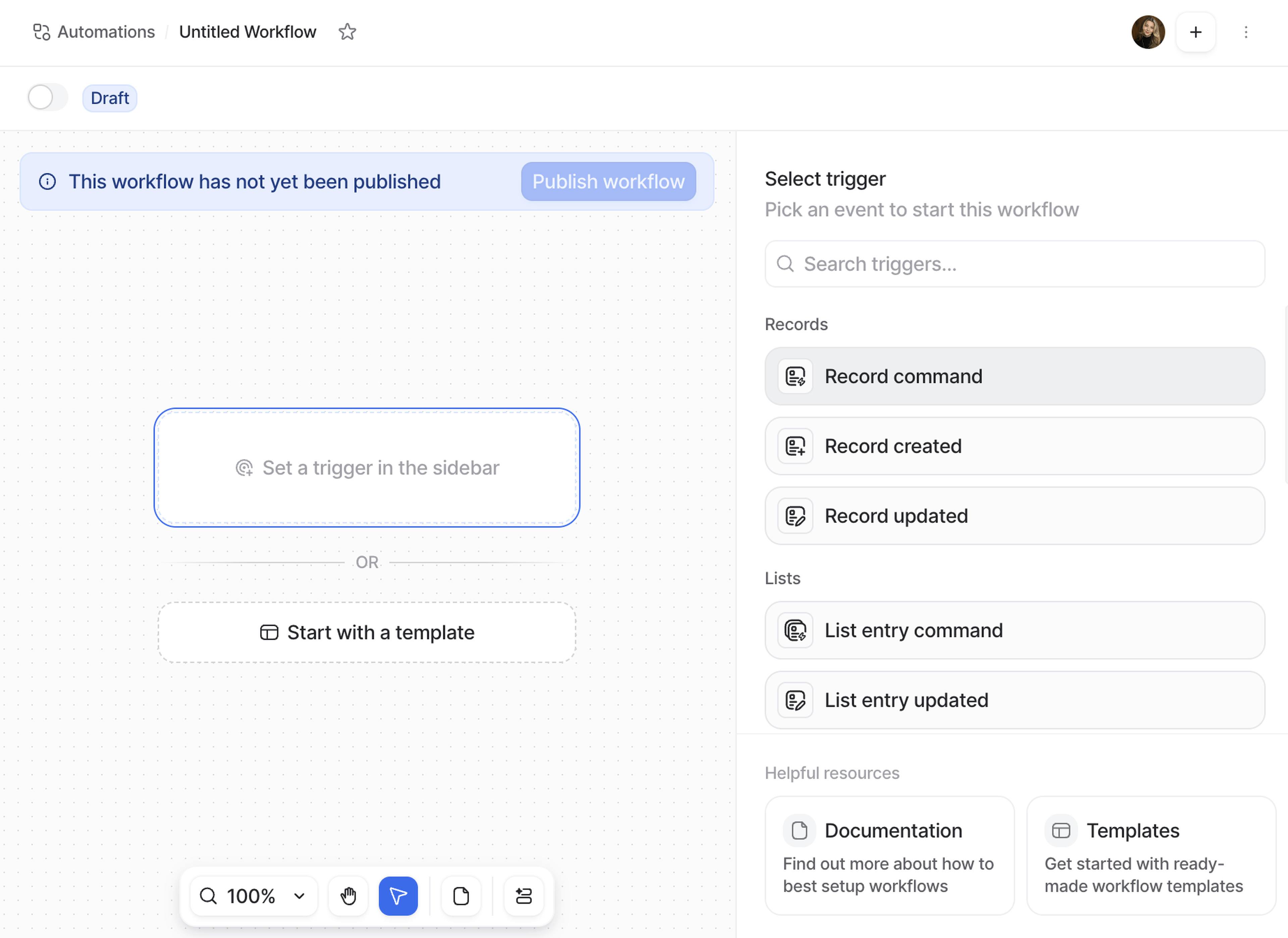 To create a new workflow, click New workflow at the top right of the Workflows page. You’ll now see your canvas, which is where you can visually build out your workflow.
