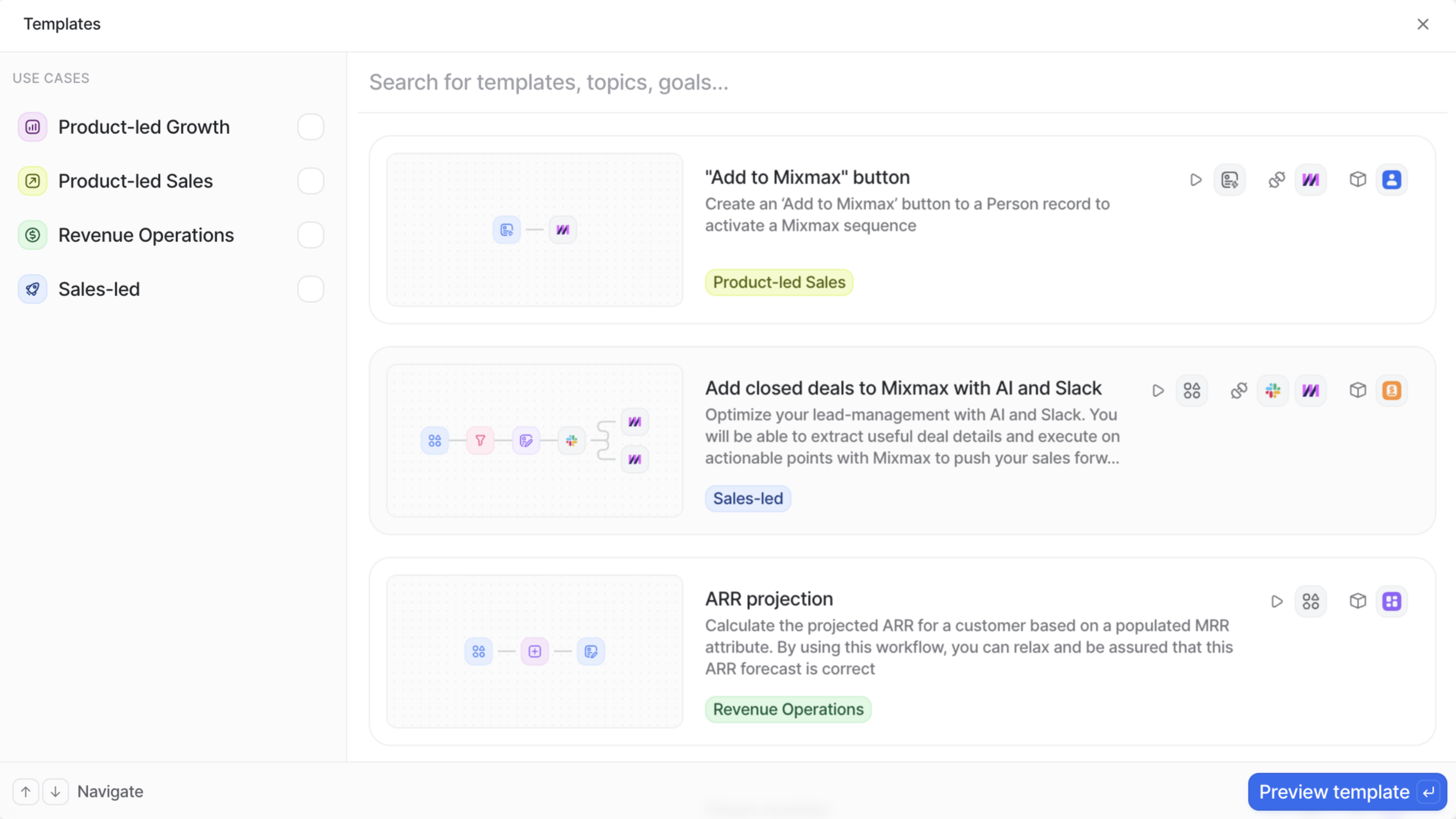 Templates contain pre-built blocks and patterns for common go-to-market activities. There are over 20 by default included with Attio, and you can search for a specific template, or filter by category.