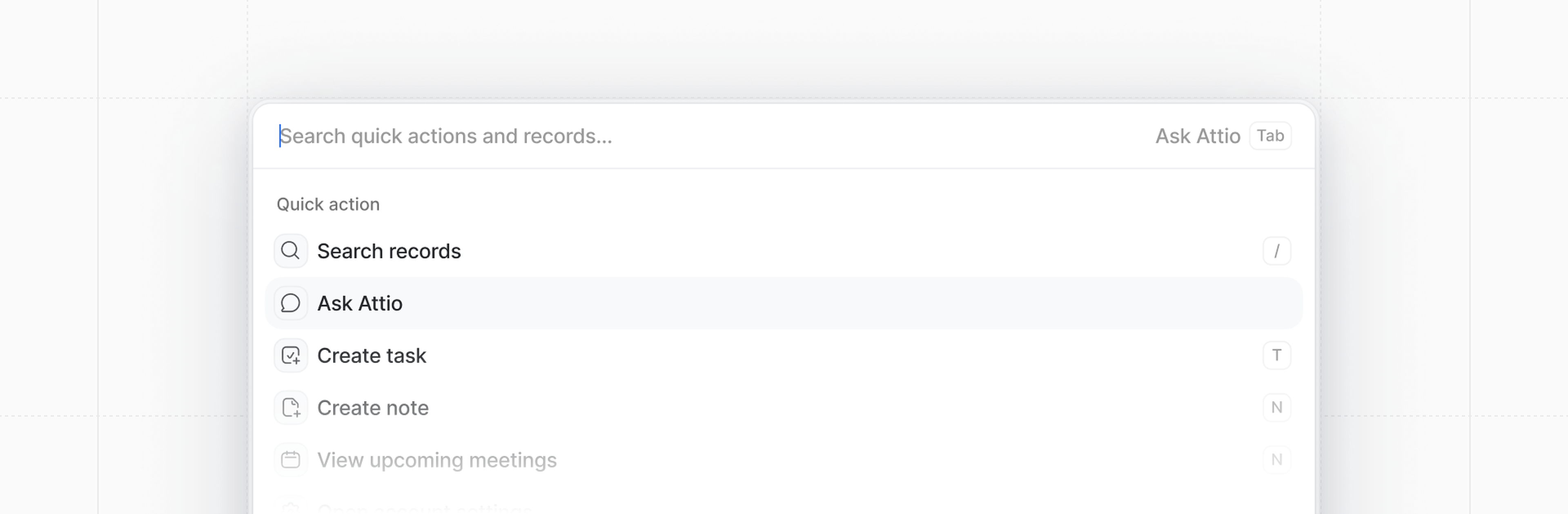 Quick actions: Press ⌘K and select Ask Attio, or type a prompt and press the tab key.