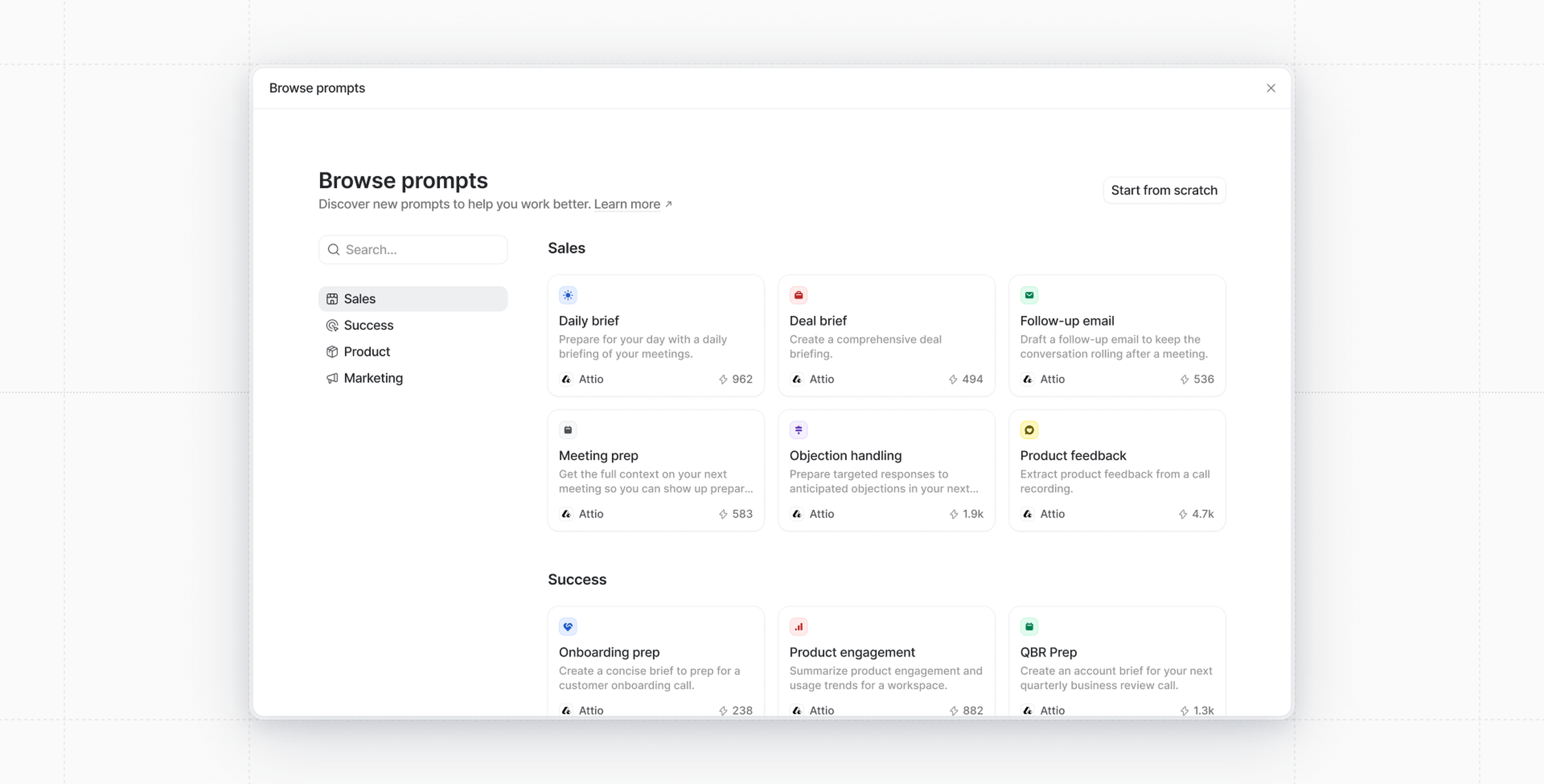Create Ask Attio prompts from scratch or browse the prompt library.