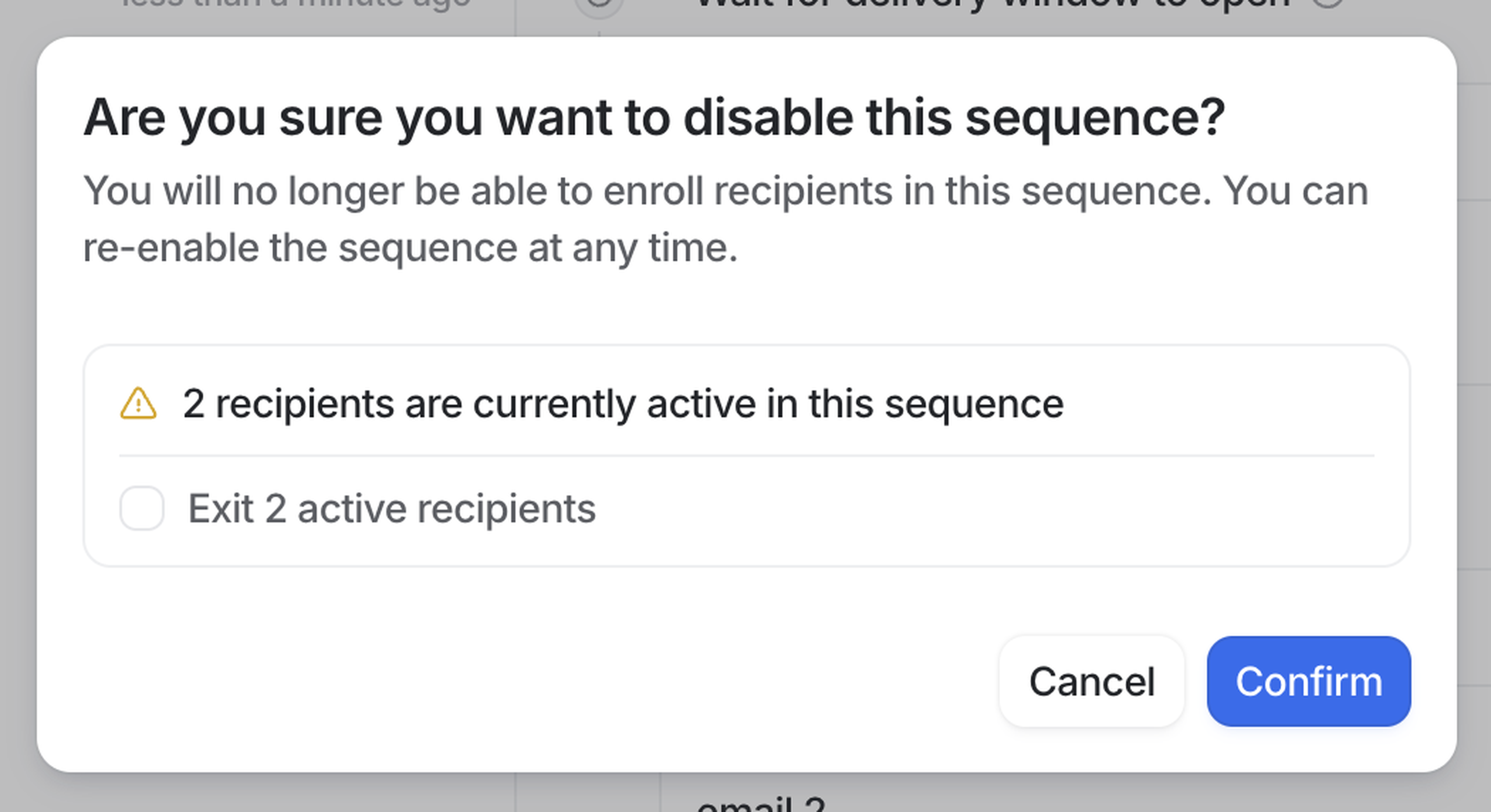 To disable or enable a sequence, toggle the Enable sequence option in the upper-right of the sequence page. Like archiving, when you disable a sequence you have a choice of whether or not to exit active recipients (see screenshot above).