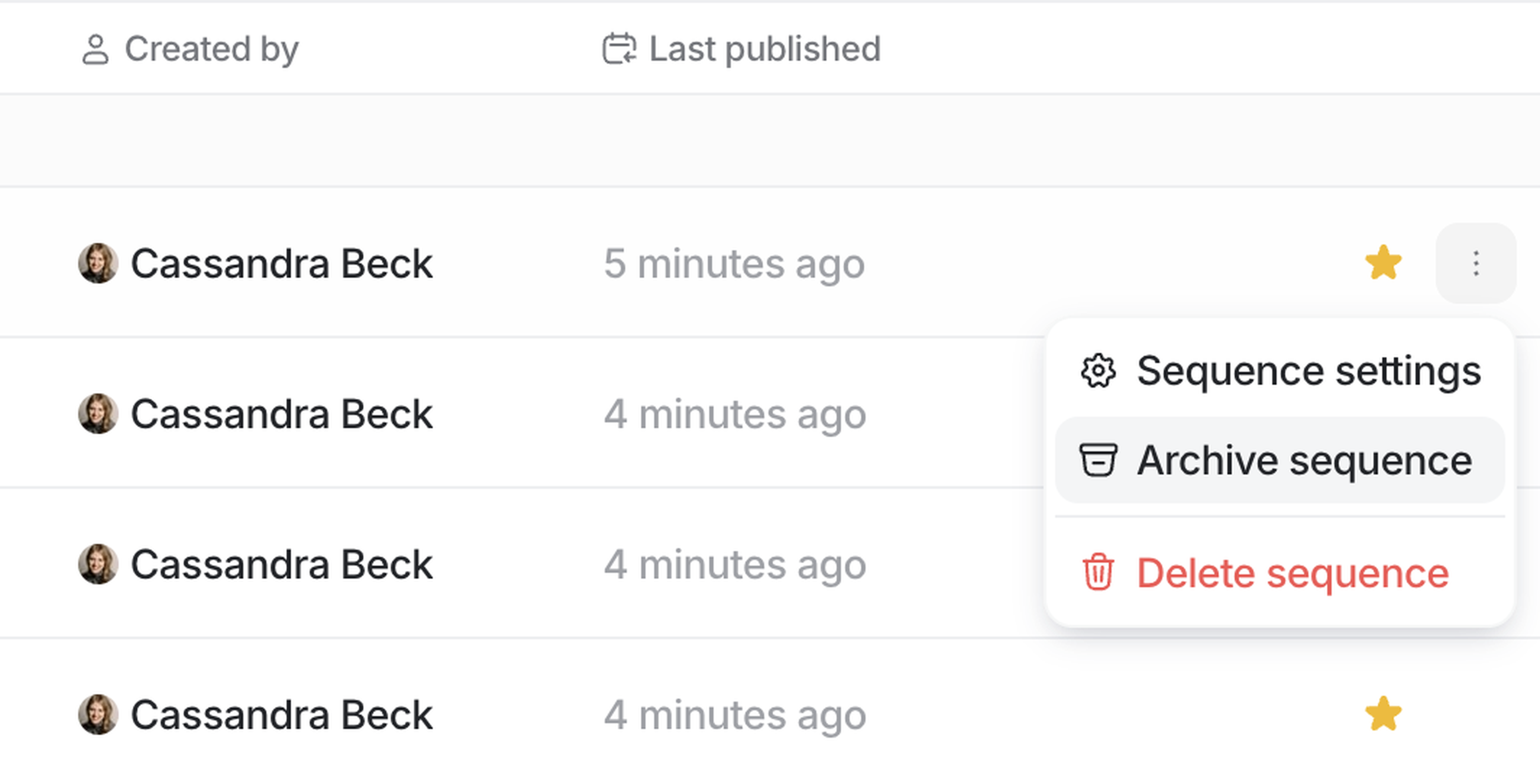 To delete a sequence draft, click the ⋮ icon and select Delete sequence, then confirm. Published sequences cannot be deleted; they can only be archived.
