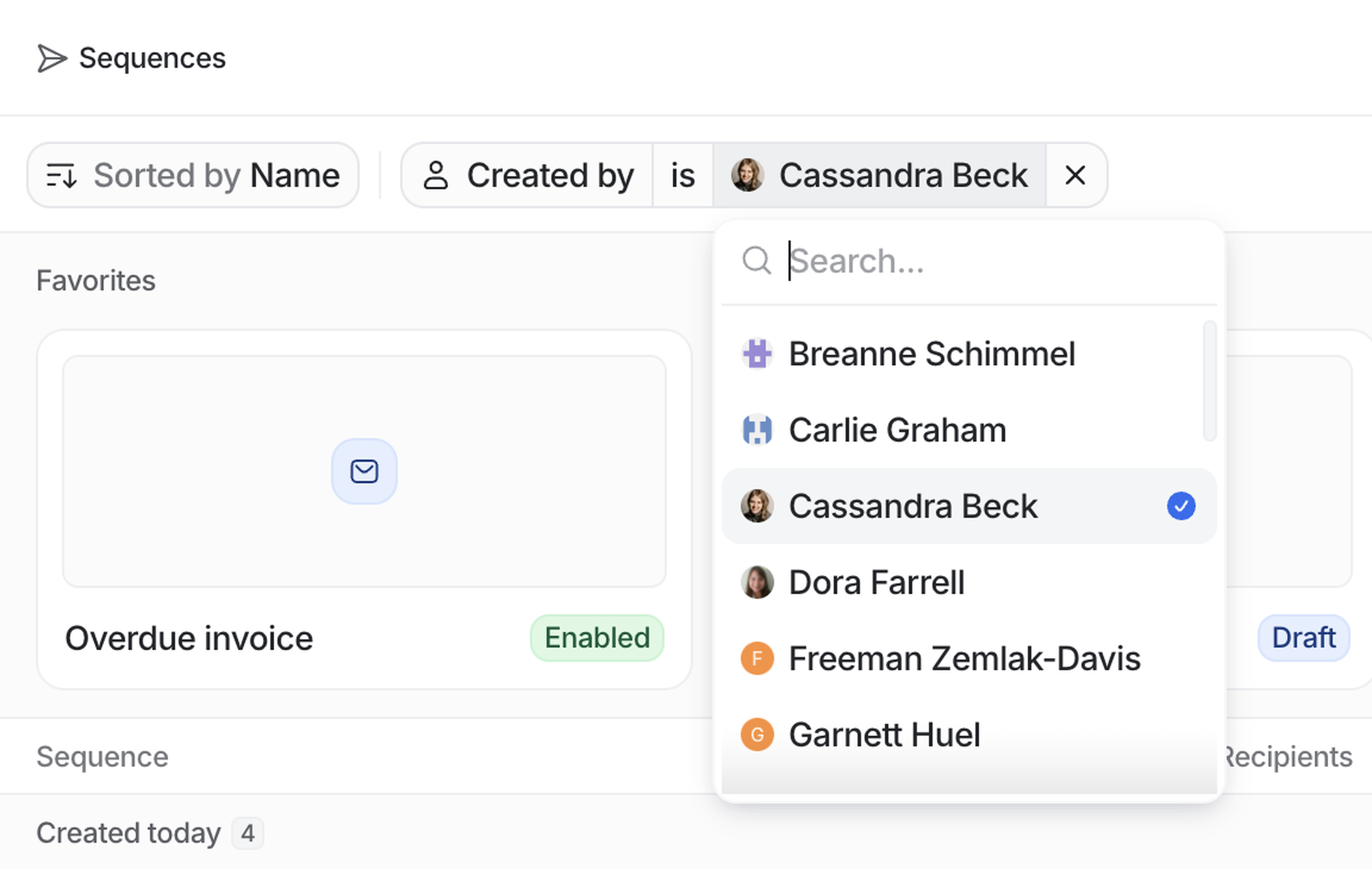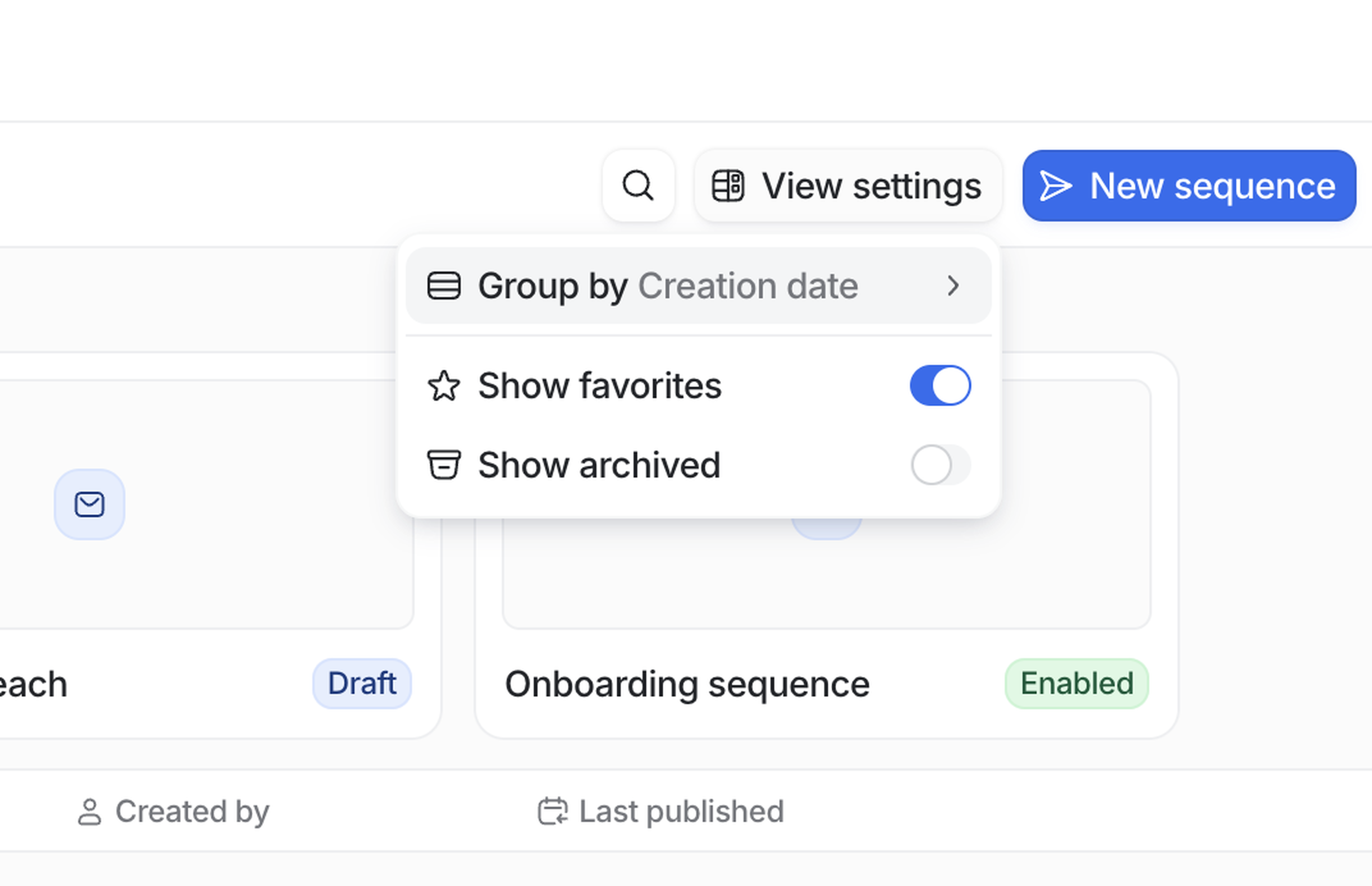 Click View settings and toggle Show favorites to display or hide sequences you've marked as favorites at the top of the page. To add a sequence to favorites, click the star icon next to it. Favorited sequences will appear under Favorites at the top of the Sequences page and in your sidebar under Favorites.