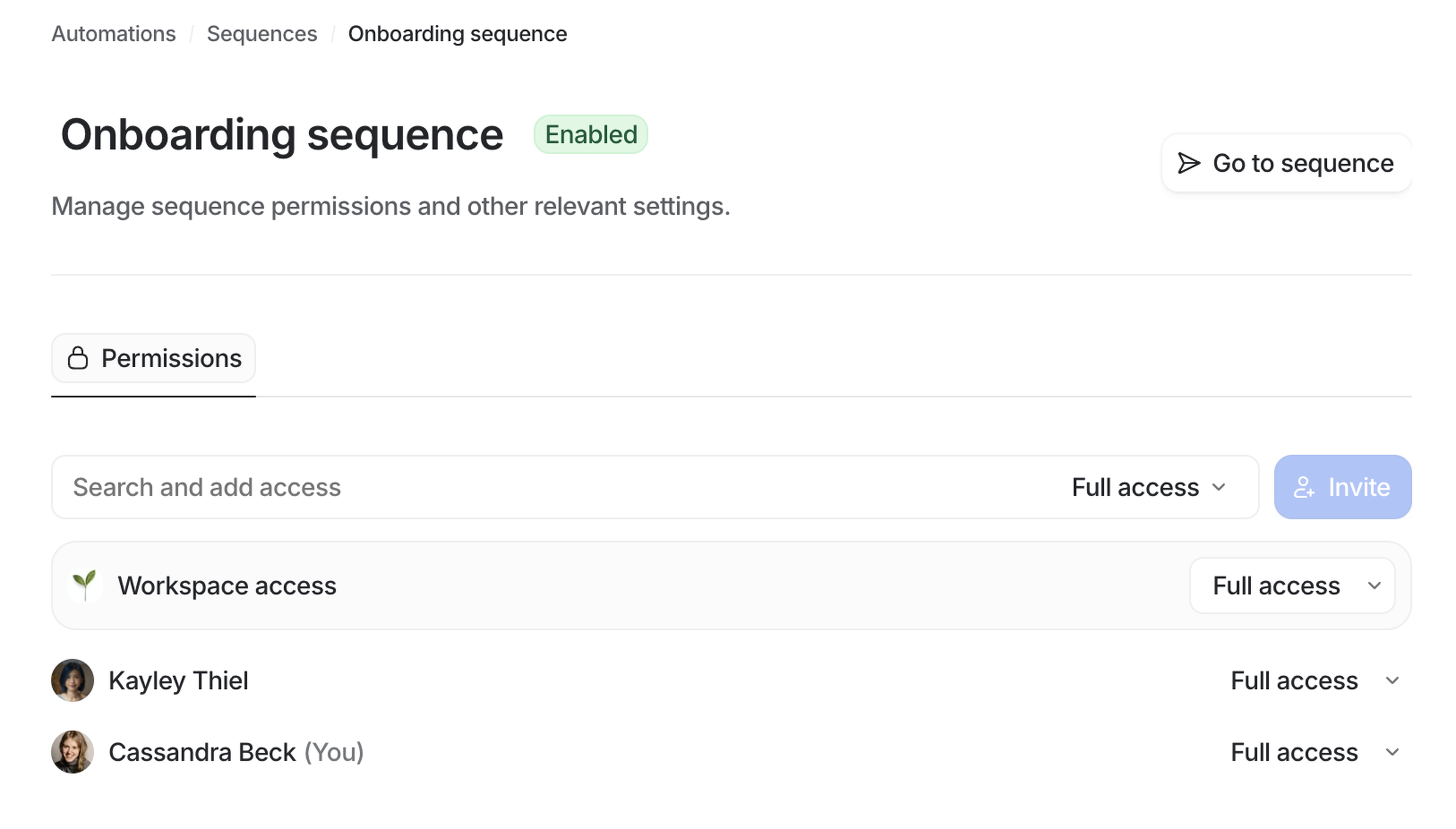 Select a sequence, and on the Permissions tab, admins can manage sequence access for the workspace and individual members.