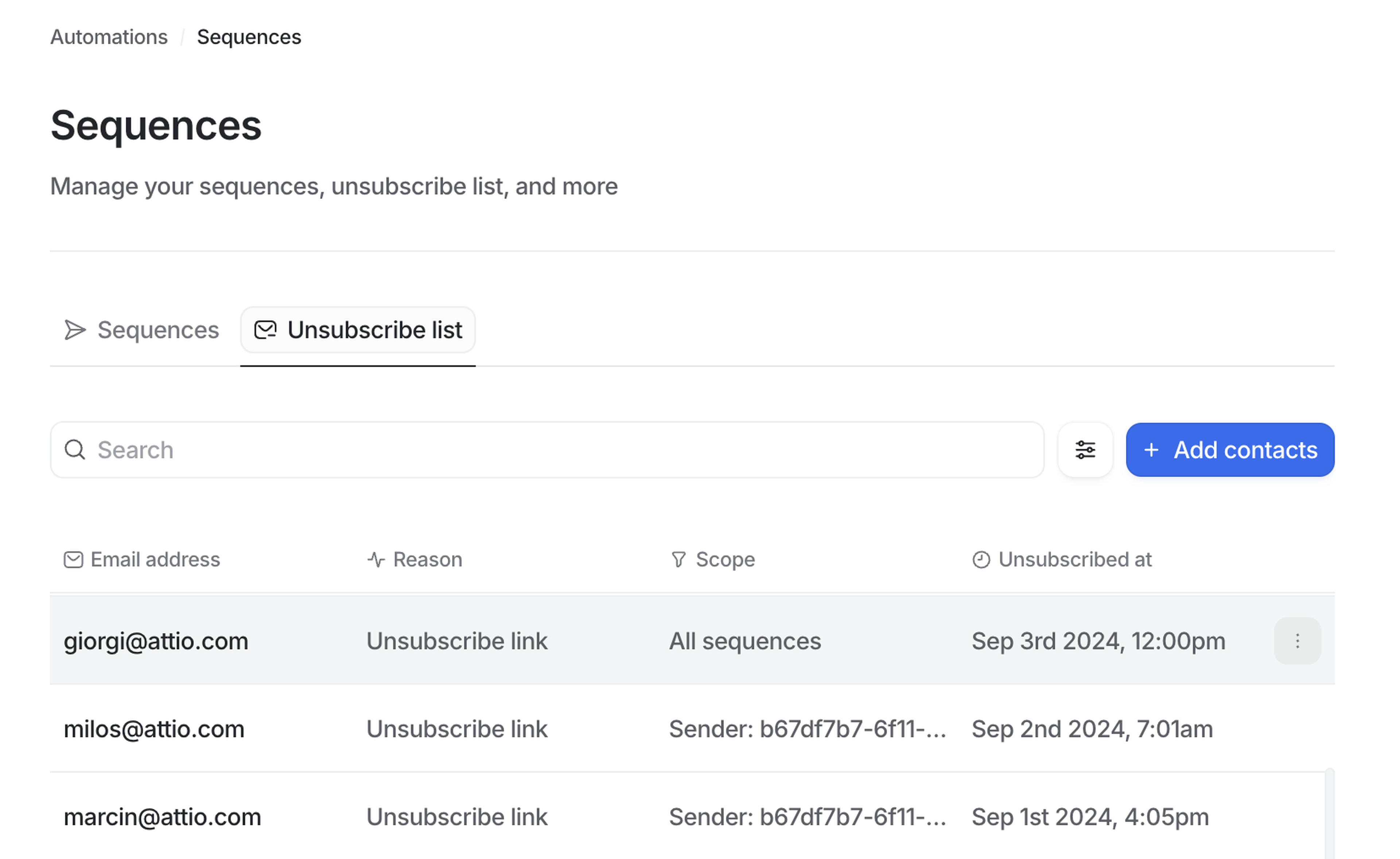 You can also add contacts to the unsubscribe list manually to prevent them from being enrolled in any sequences with the + Add contacts button.