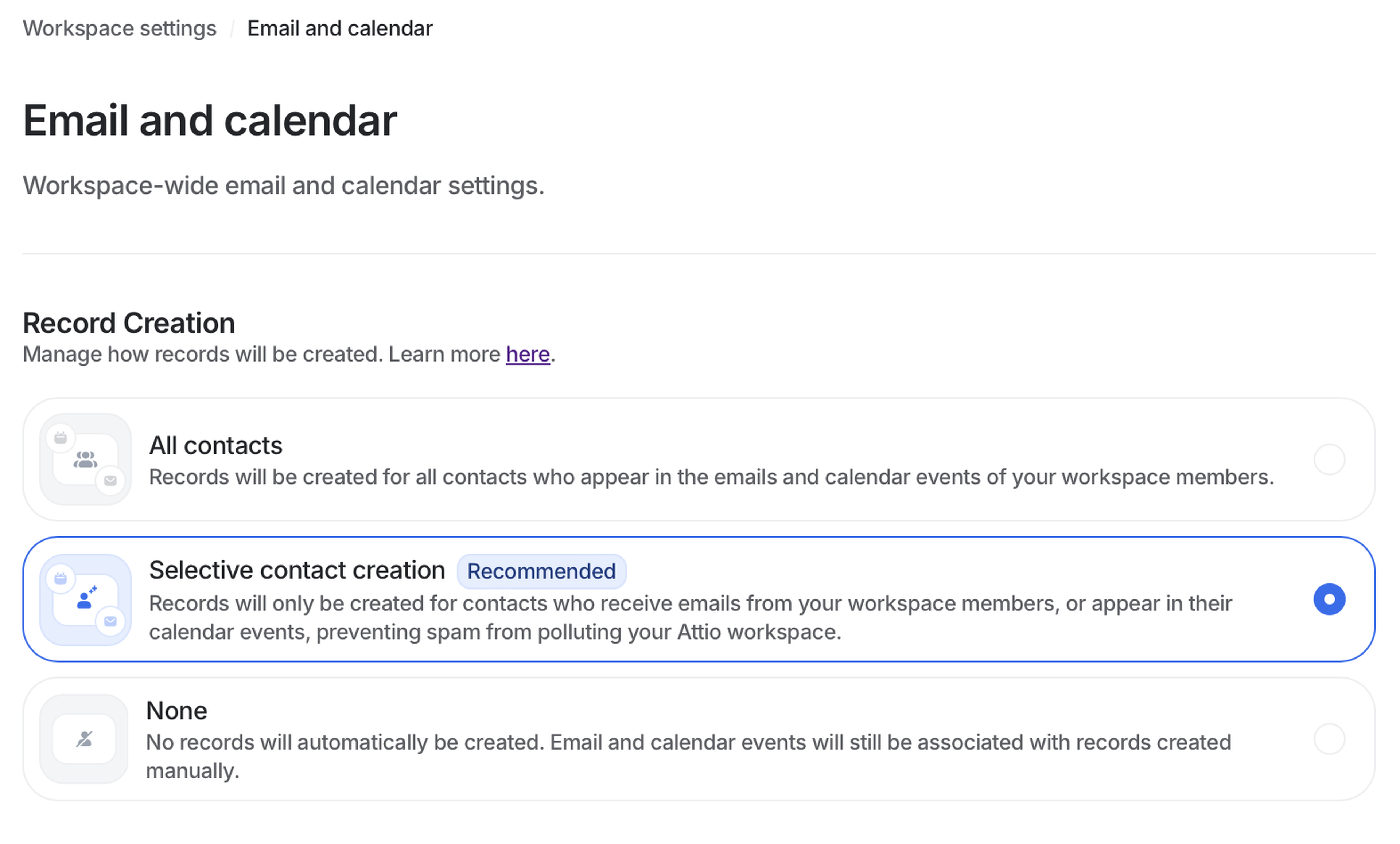 Selective contact creation (default): Creates records only for people your team has emailed or had calendar events with. Records are not created for contacts that email you if you have not emailed them back. This is to prevent things like spam, notifications, and newsletters from cluttering your workspace.