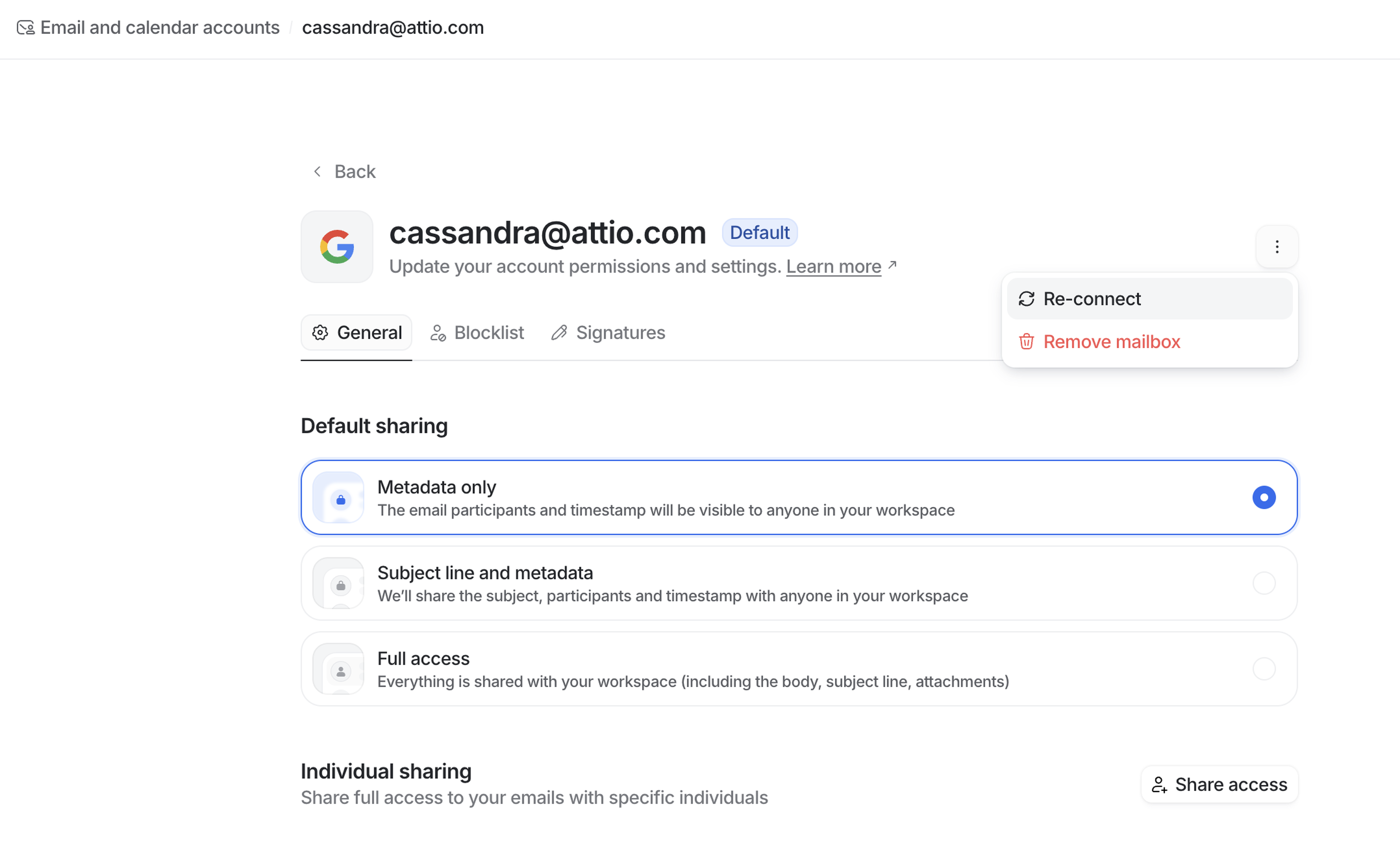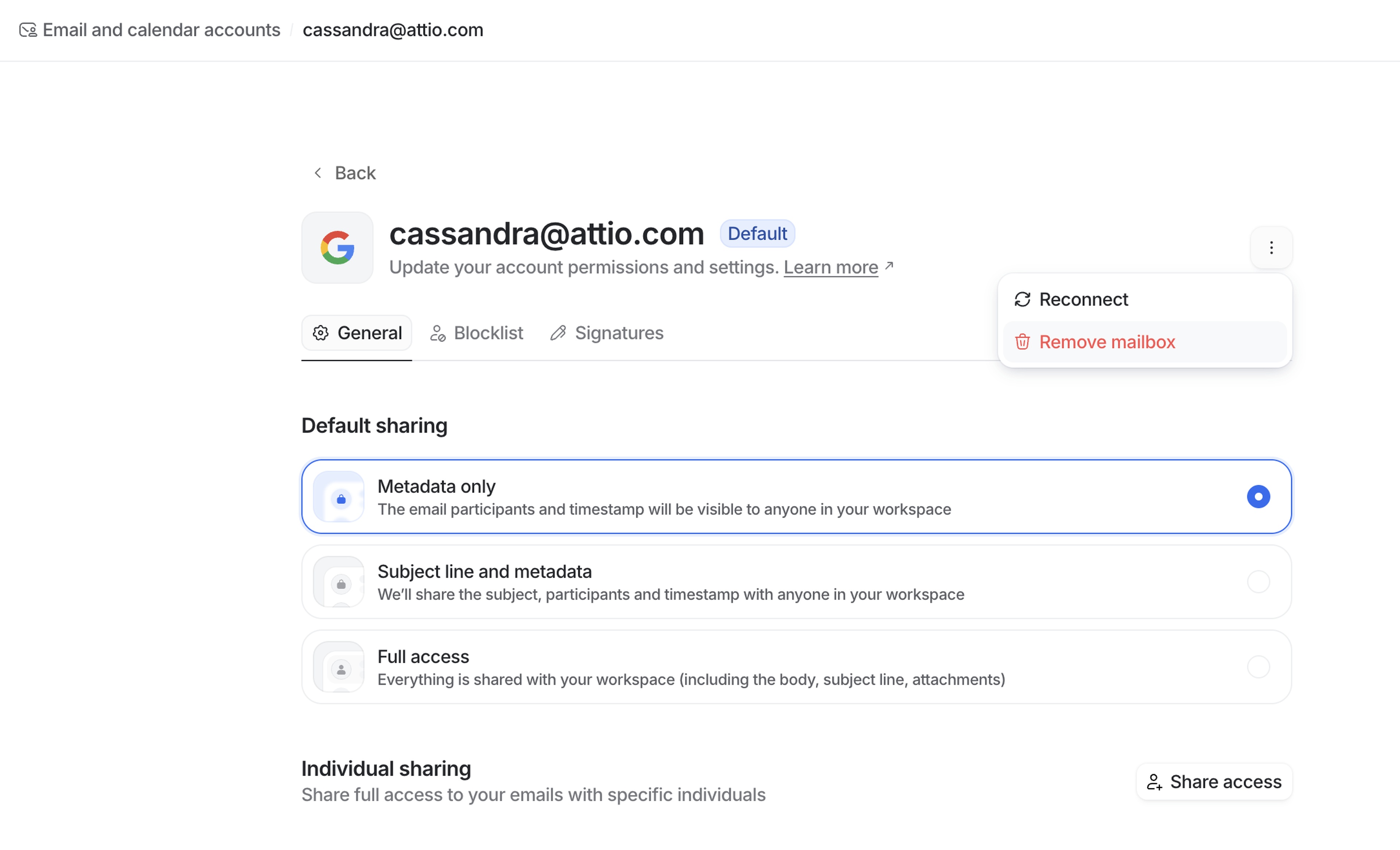 After syncing, configure your default email sharing settings. Learn how to share emails, and how to keep emails private in Attio.
