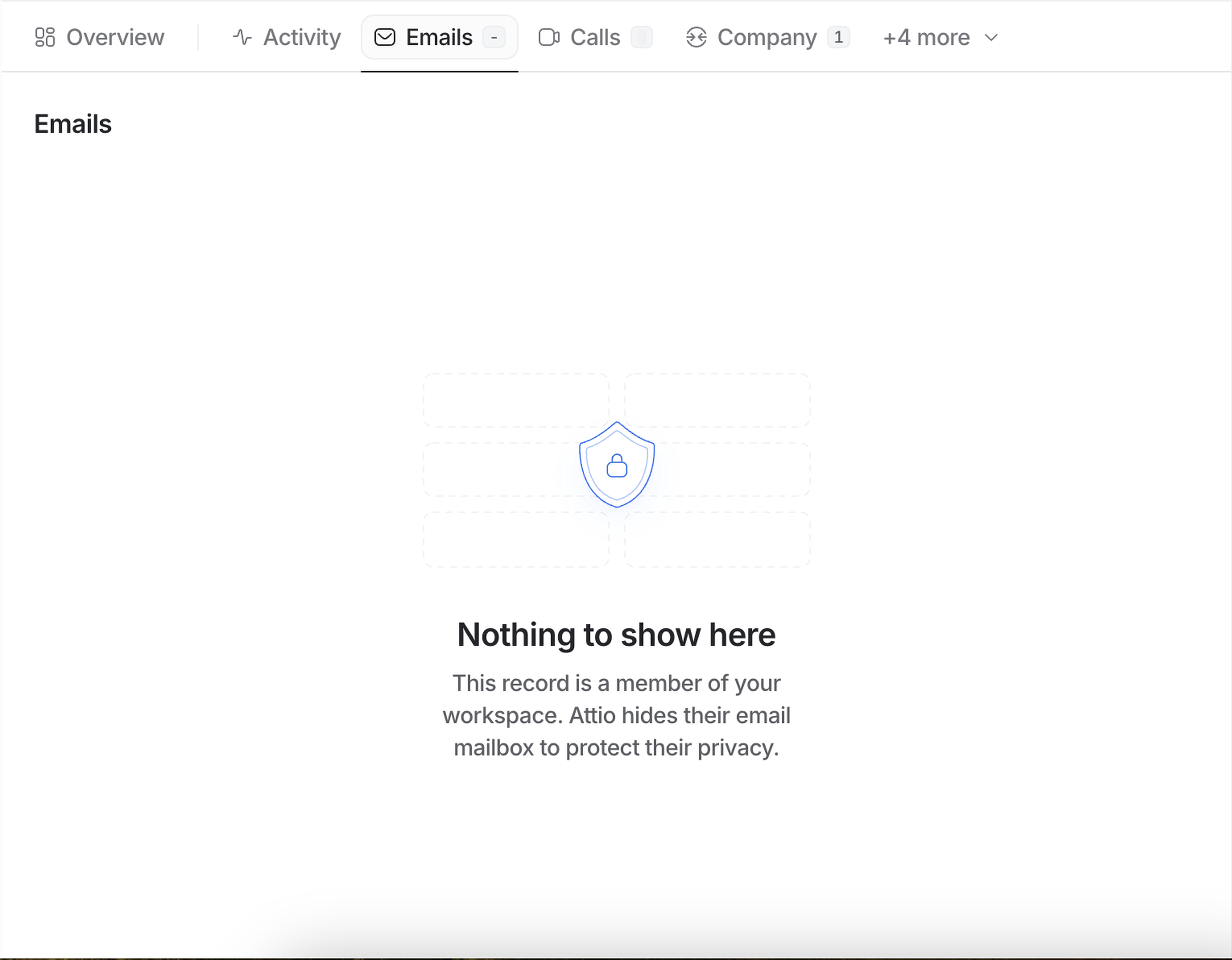 If you're viewing a record page associated with a domain or email address that an invited teammate or teammate with an active Attio account uses to log in or has synced to Attio, Attio will show "Nothing to show here" instead of emails.