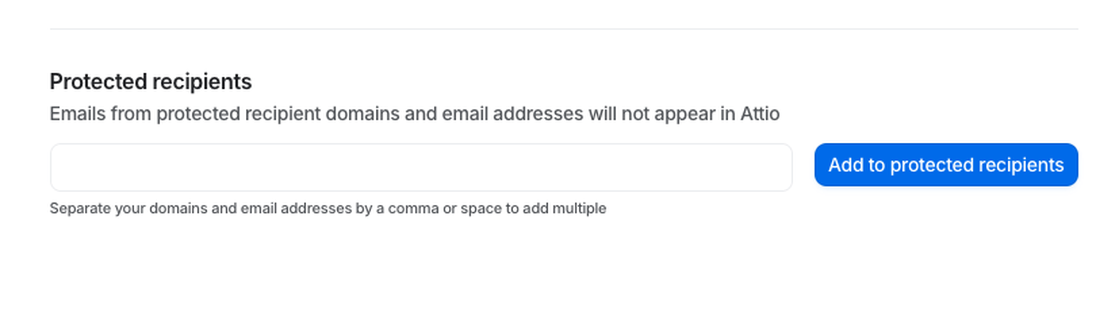 Note: Avoid blocklisting domains or email addresses your team members have synced. This would stop Attio from syncing all emails that include your team. Attio already protects internal communications by hiding emails from team members’ record pages.