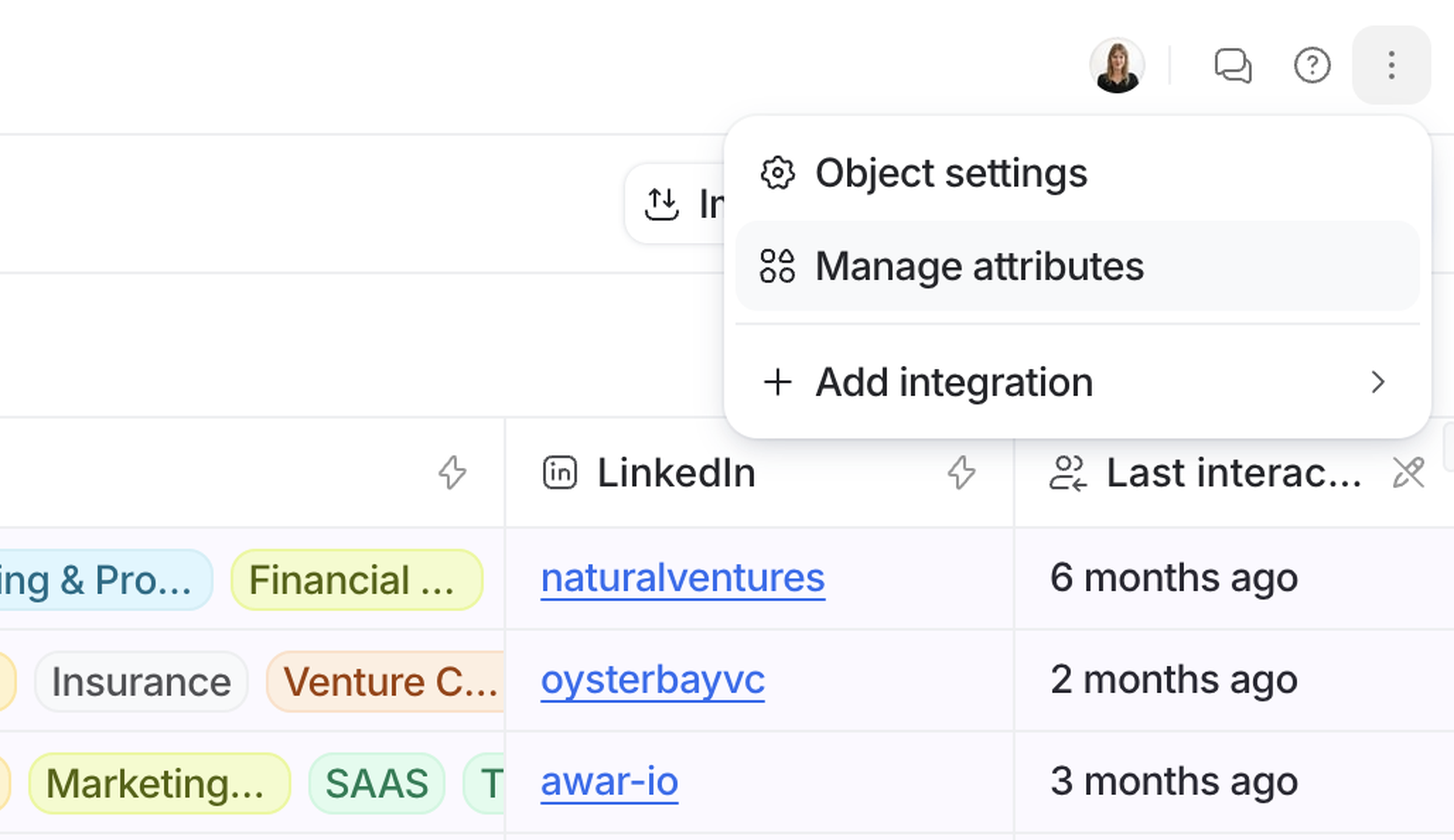 From any table or kanban view, select the ⋮ icon in the top right corner and choose Manage attributes.