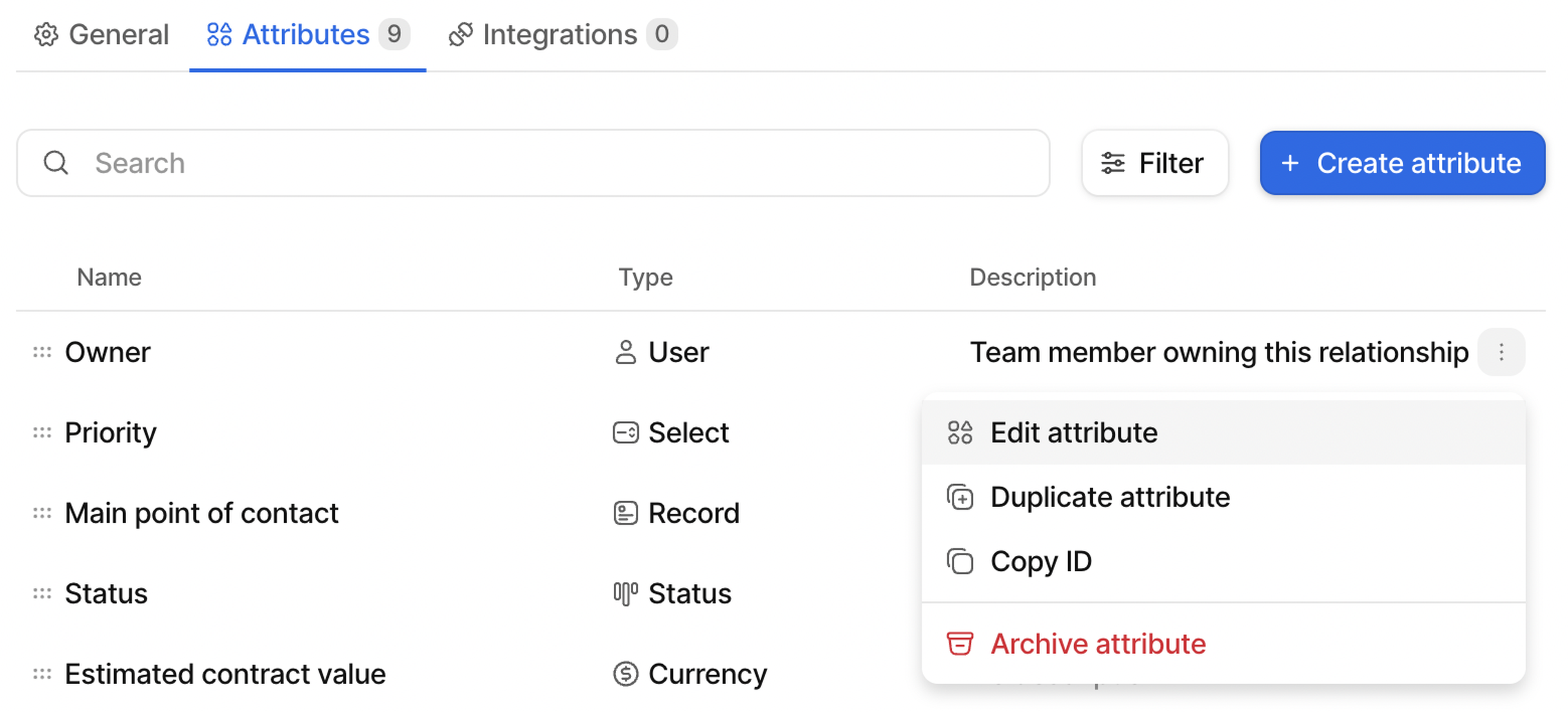 From attribute settings for the object or list, select the ⋮ icon to the right of an attribute to edit, duplicate, archive, or restore the attribute if it is archived. Note that enriched and system attributes cannot be archived, and most cannot be edited.