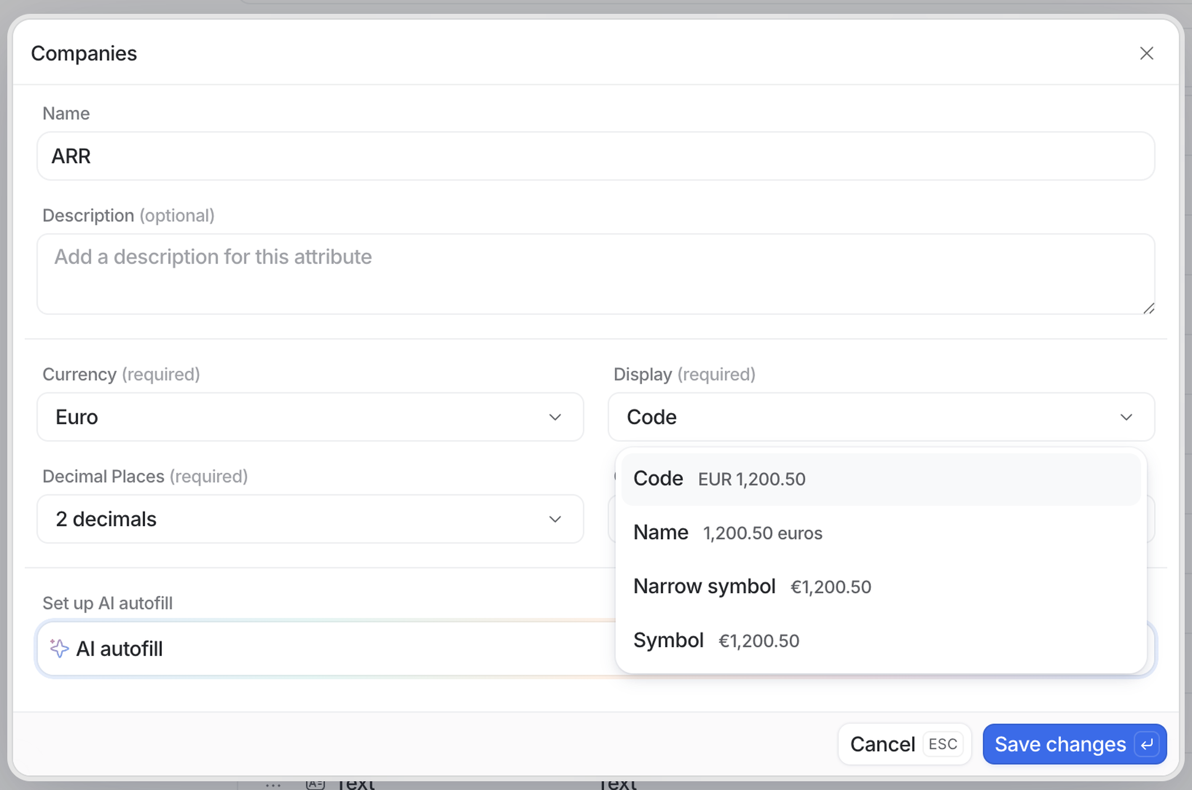 When creating or editing Currency or Number attributes, you can configure how values appear in table views, kanban views, and record views: