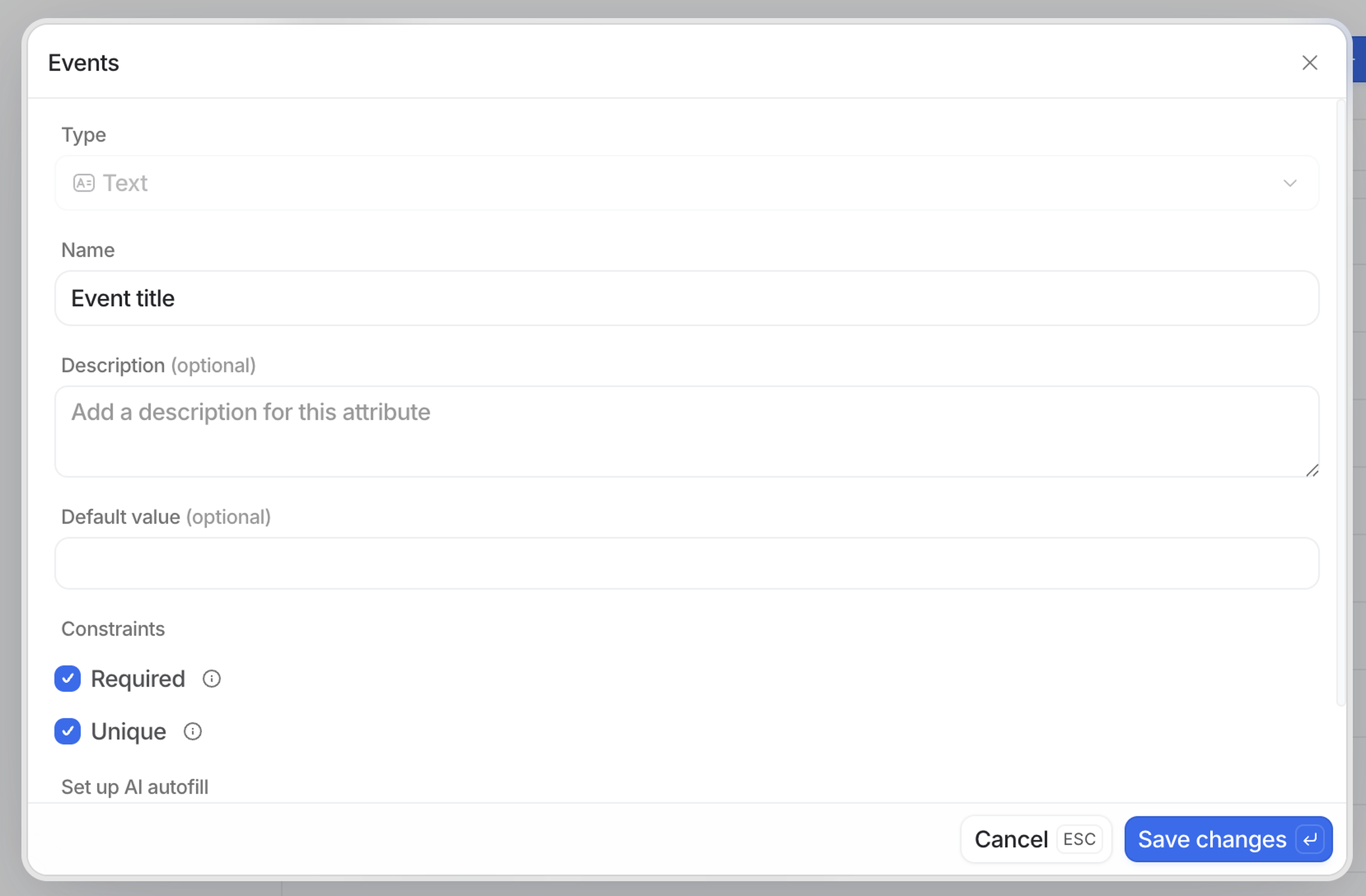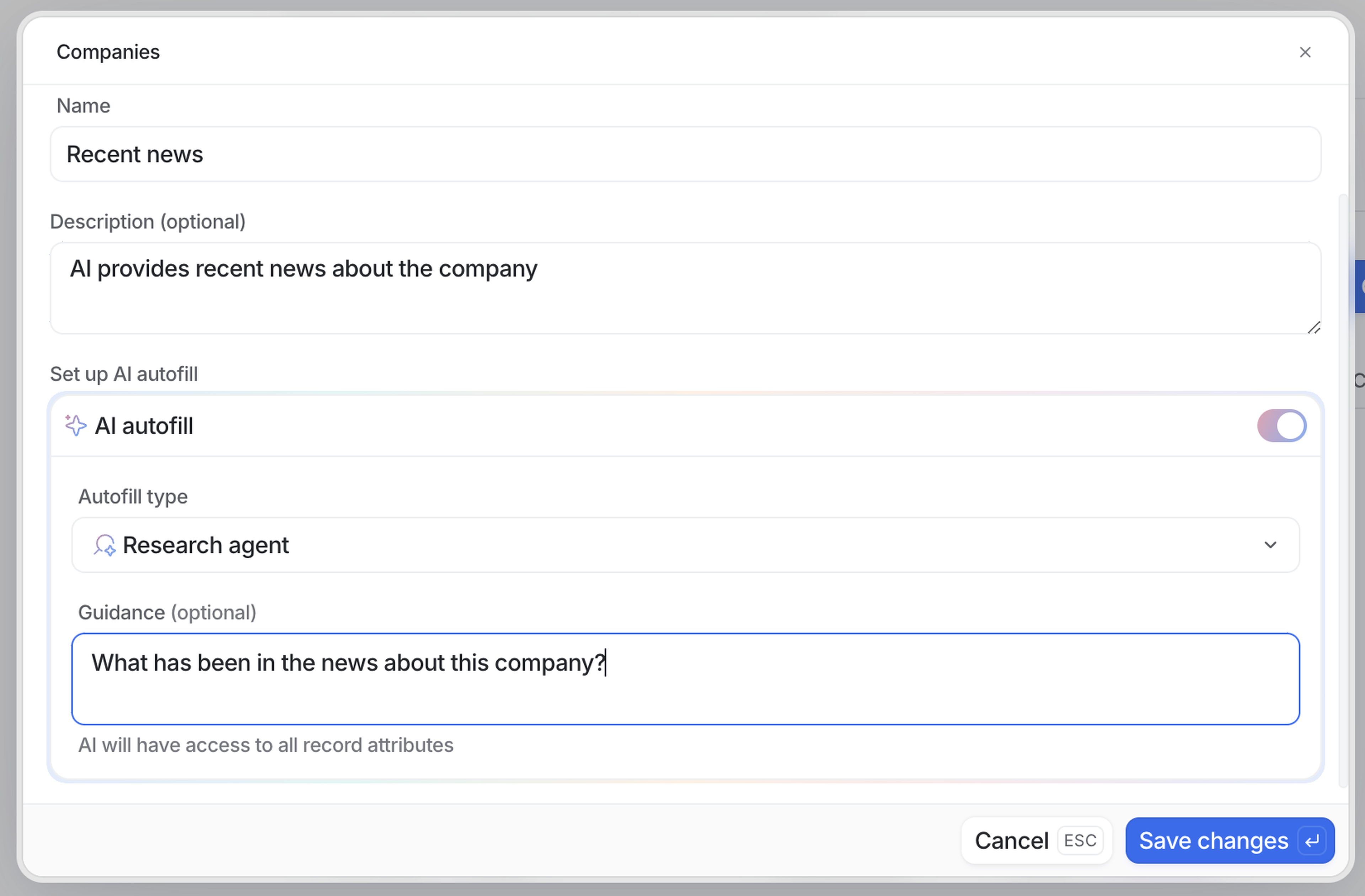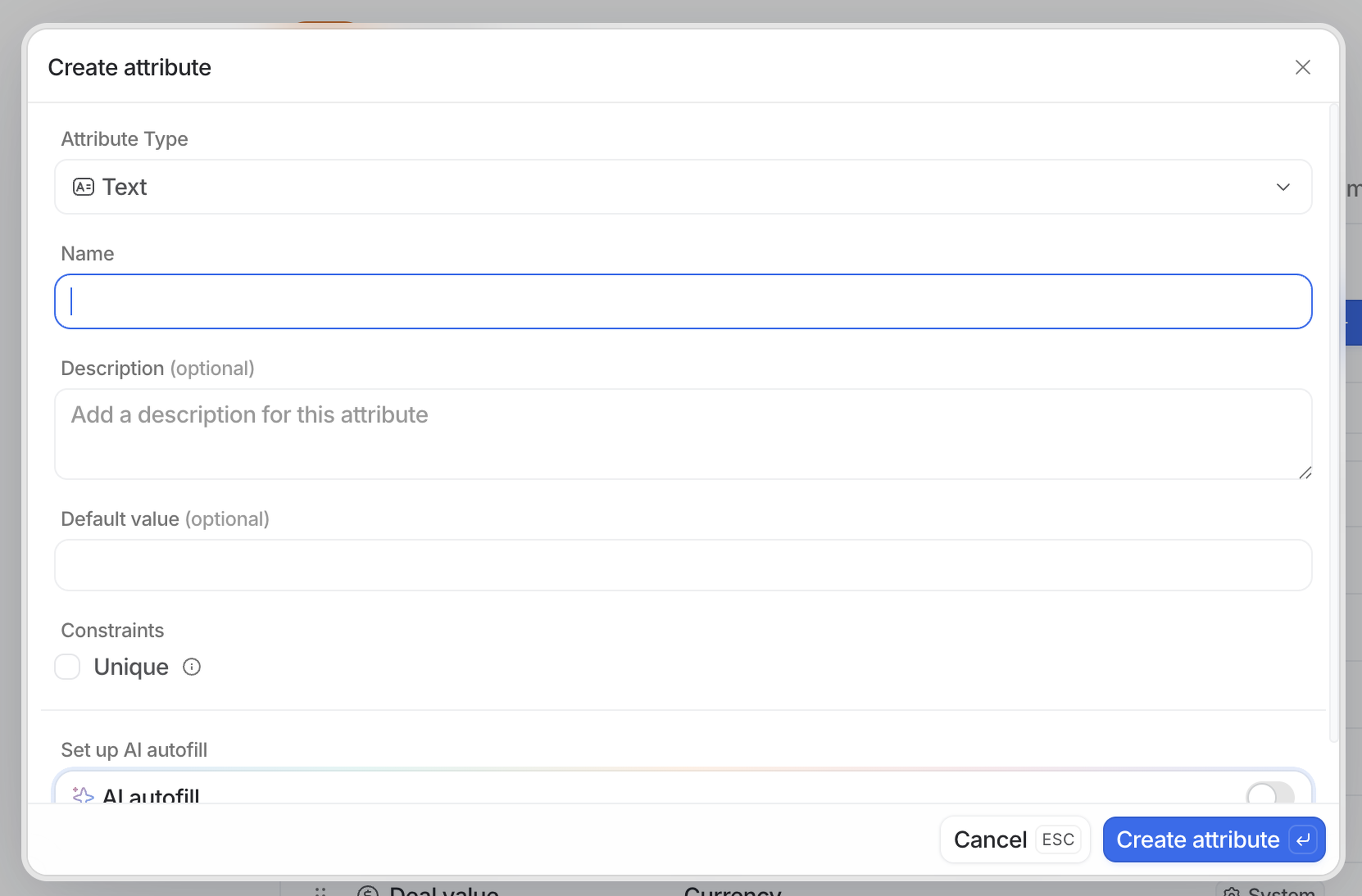 Text, Select, and Multi-select attributes include an optional AI Autofill setting. This feature allows Attio to automatically generate attribute values using AI. Learn more in AI attributes.