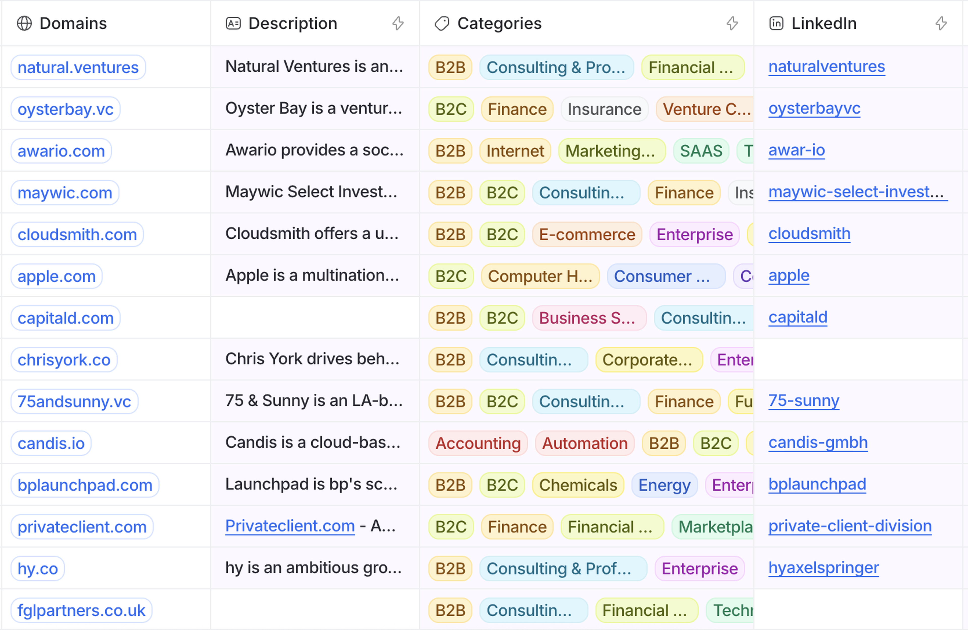 Attributes are useful for filtering, sorting, and segmenting your records to fit your workflow. Each column in the below table view is an attribute: Domains, Description, Categories, and LinkedIn.