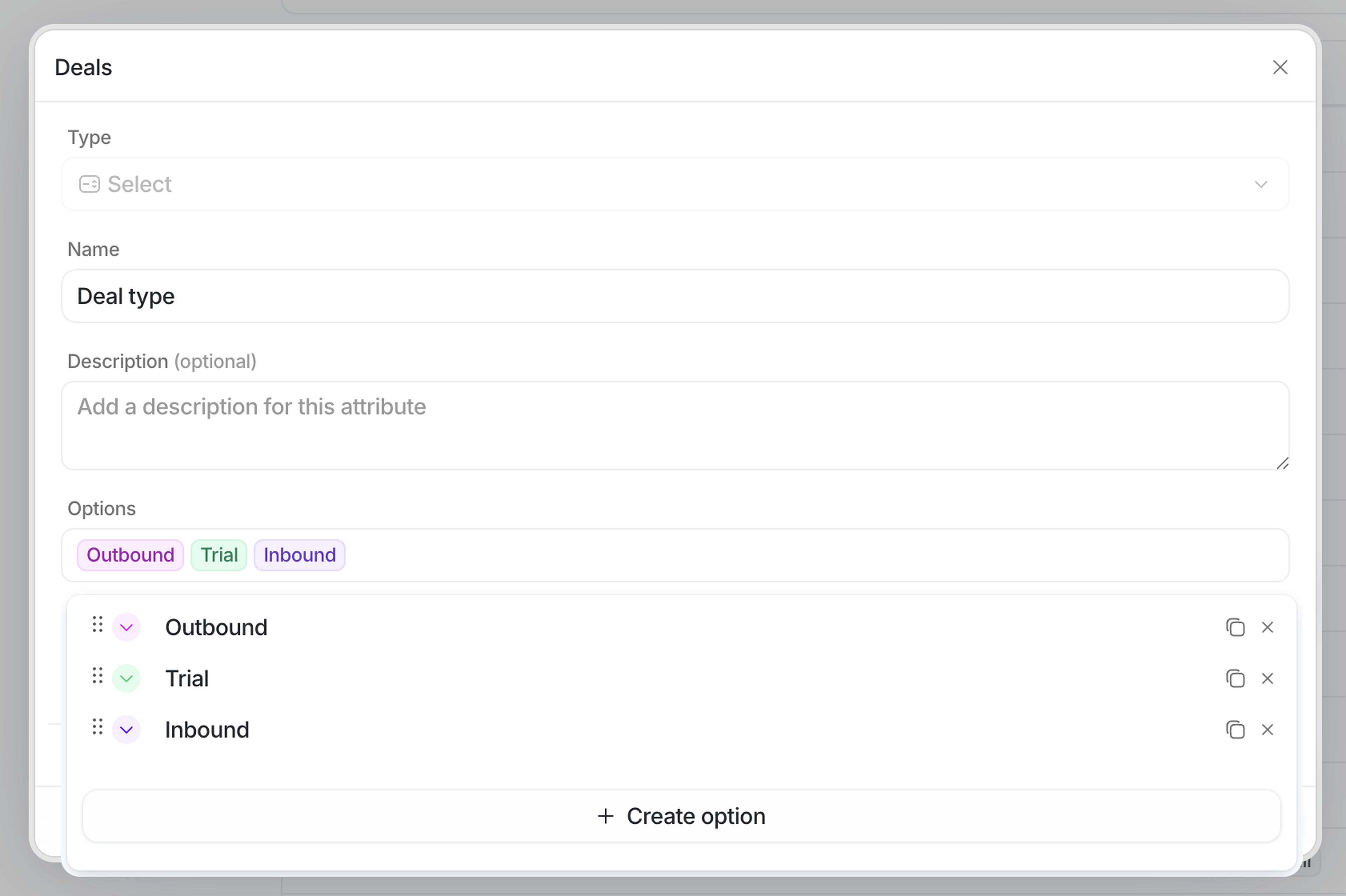 For attribute types like Select and Multi-select, you can define a set of options that appear in a dropdown. This lets users choose from preset values instead of typing them manually, similar to a multiple choice field in a form.