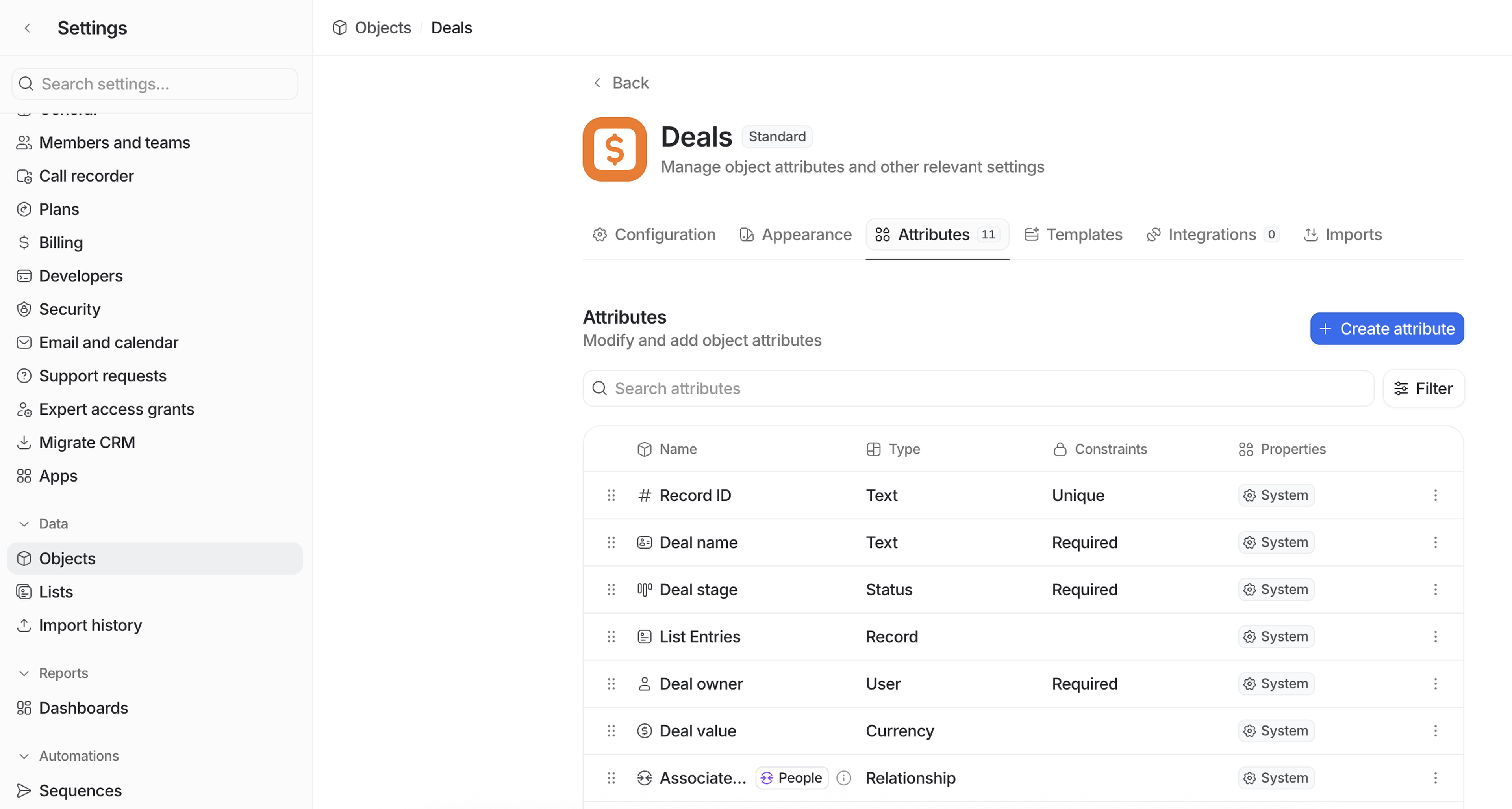 Each object in Attio, such as People, Companies, or Deals, includes a set of system attributes. These are built-in fields automatically created by Attio. While system attributes cannot be deleted or archived, you can customize which attributes are shown on record pages. For a complete list of system attributes available for standard objects, see Manage standard objects.