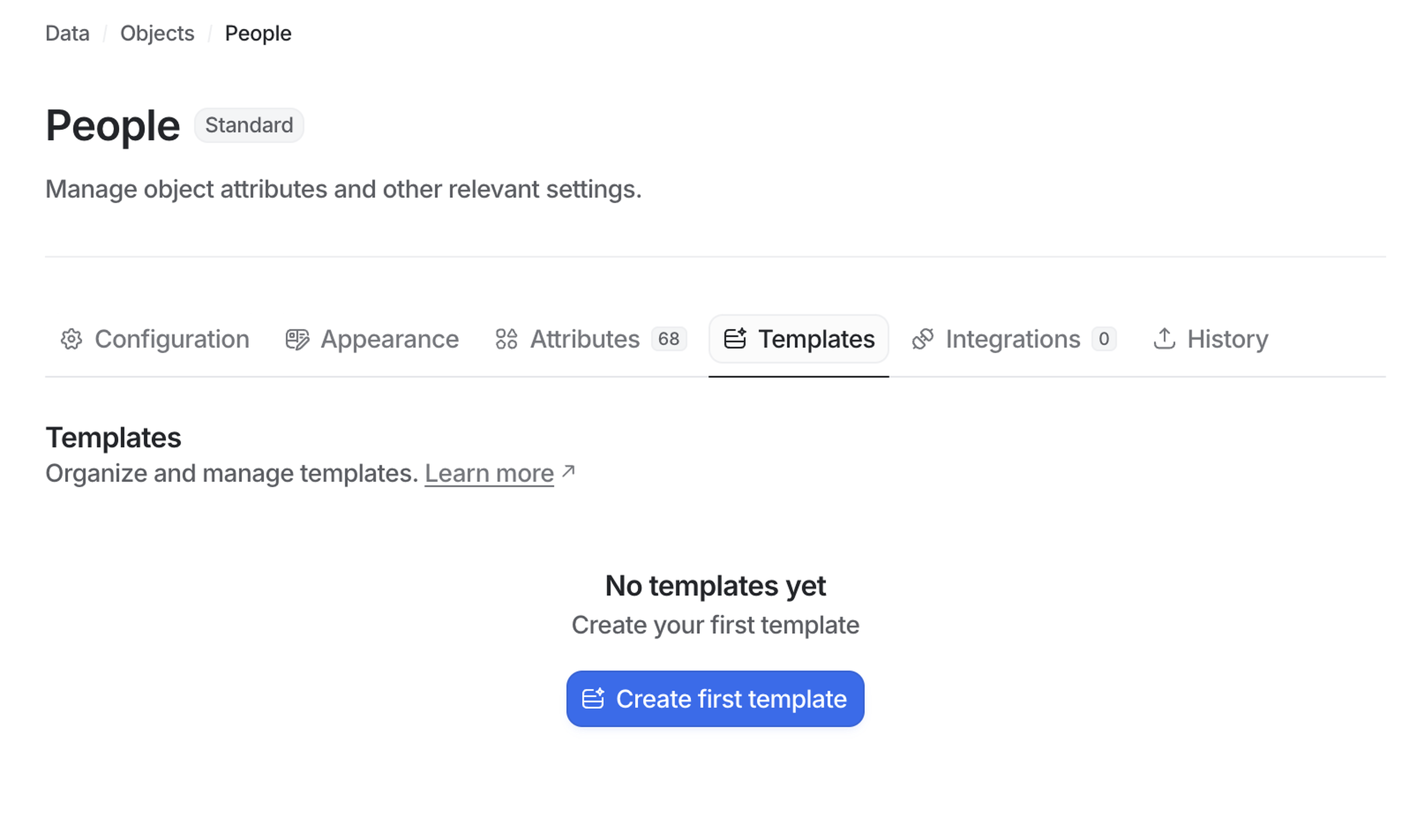 To customize which attributes are shown when a record or list entry is created, workspace administrators can create a new template for an object, and admins or full access list members can create a template for a list. The attributes that can be added depend on the template type: