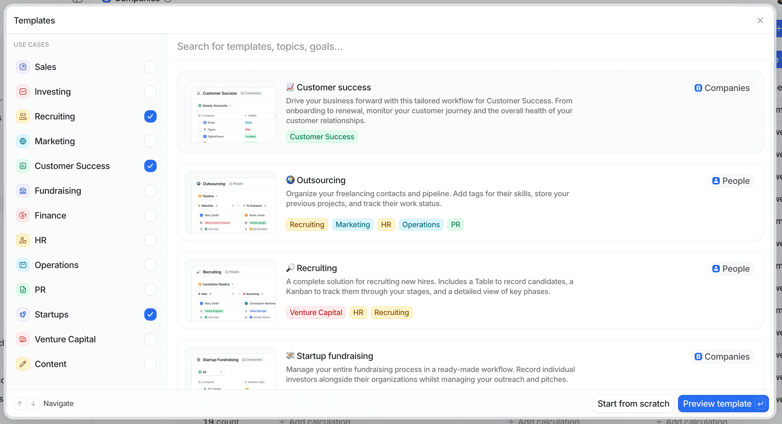 When creating a new list you can choose from our templates, organized by popular use cases. When you choose to start with a template, your list will be pre-populated with some useful attributes and views to help you get started. From that starting point, you can edit and further customize your list at any time.