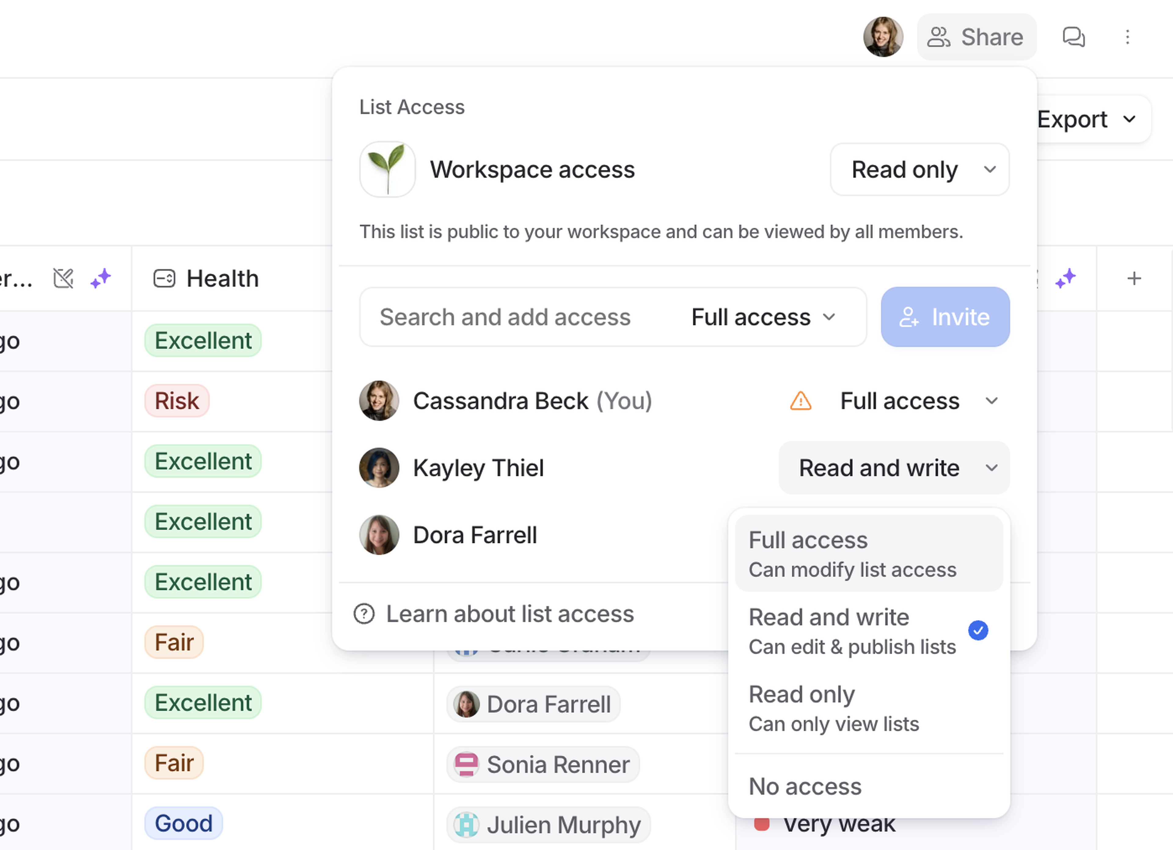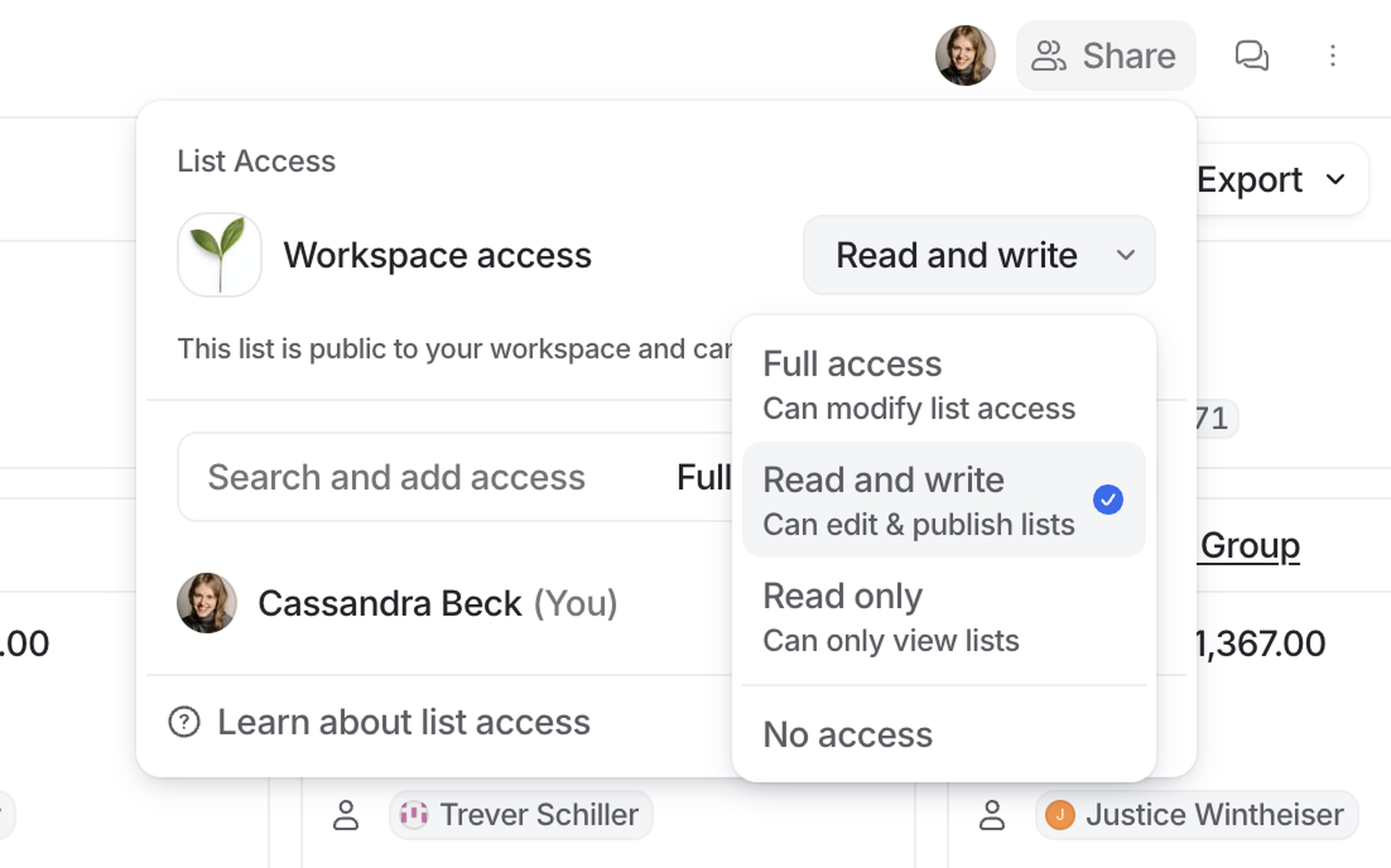 If you are a workspace admin or have Full access, you can use the dropdown to make changes to list access. If you aren't an admin and don't have Full access, you will not be able to make changes to list access settings, but you can see who does have Full access and reach out to them about any changes that need to be made (or to request that they give you Full access).