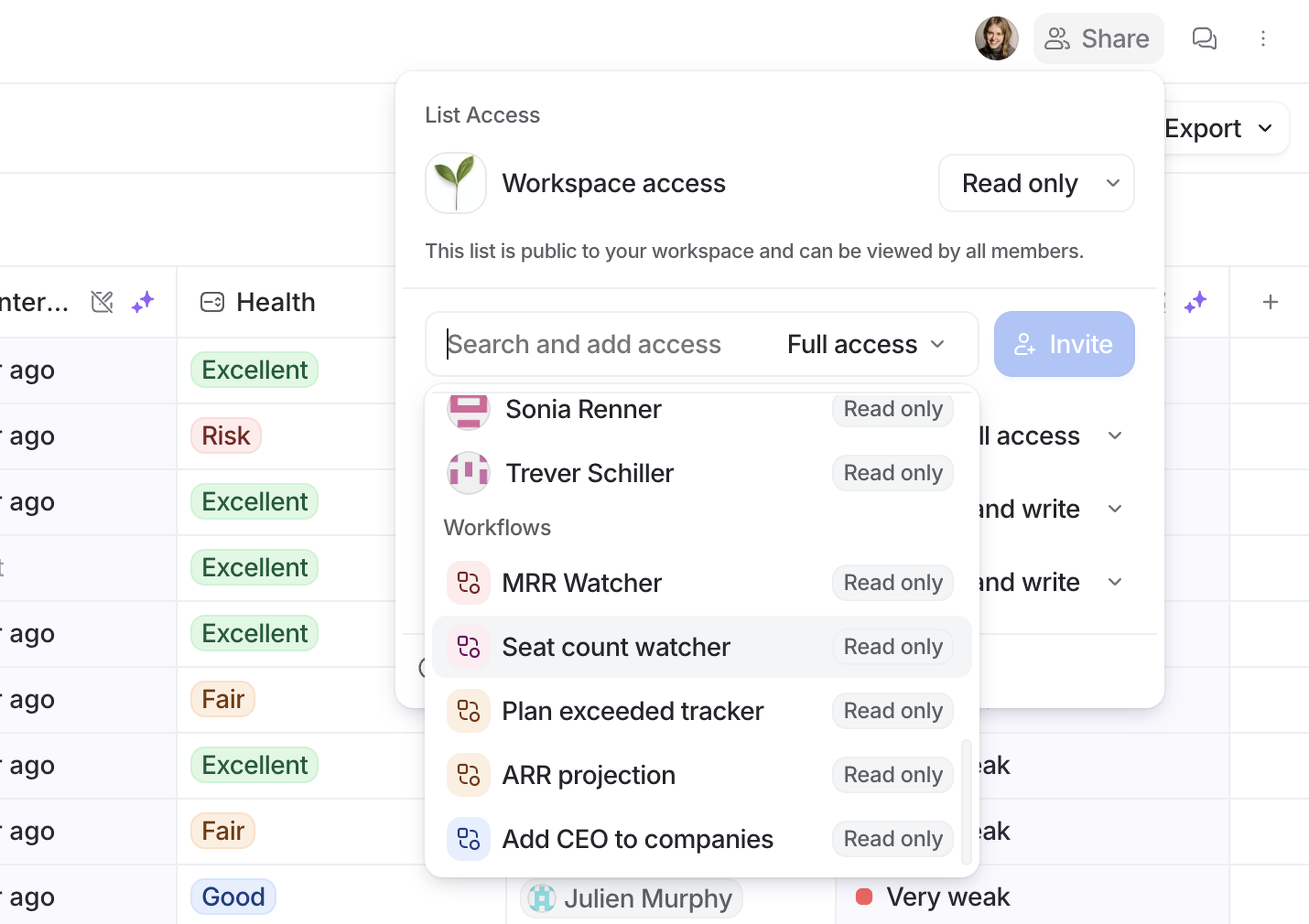 To give a workflow access to a list, you must have Full access for the list or be an admin. First, open the list and click Share in the top right corner to manage list access. Then, click into the Search and add access field, search for the name of the workflow, and select it. Next, designate the level of access the workflow should have and click Invite, just like you would for adding a team member. Once this has been done, you will be able to use the list in your workflow.