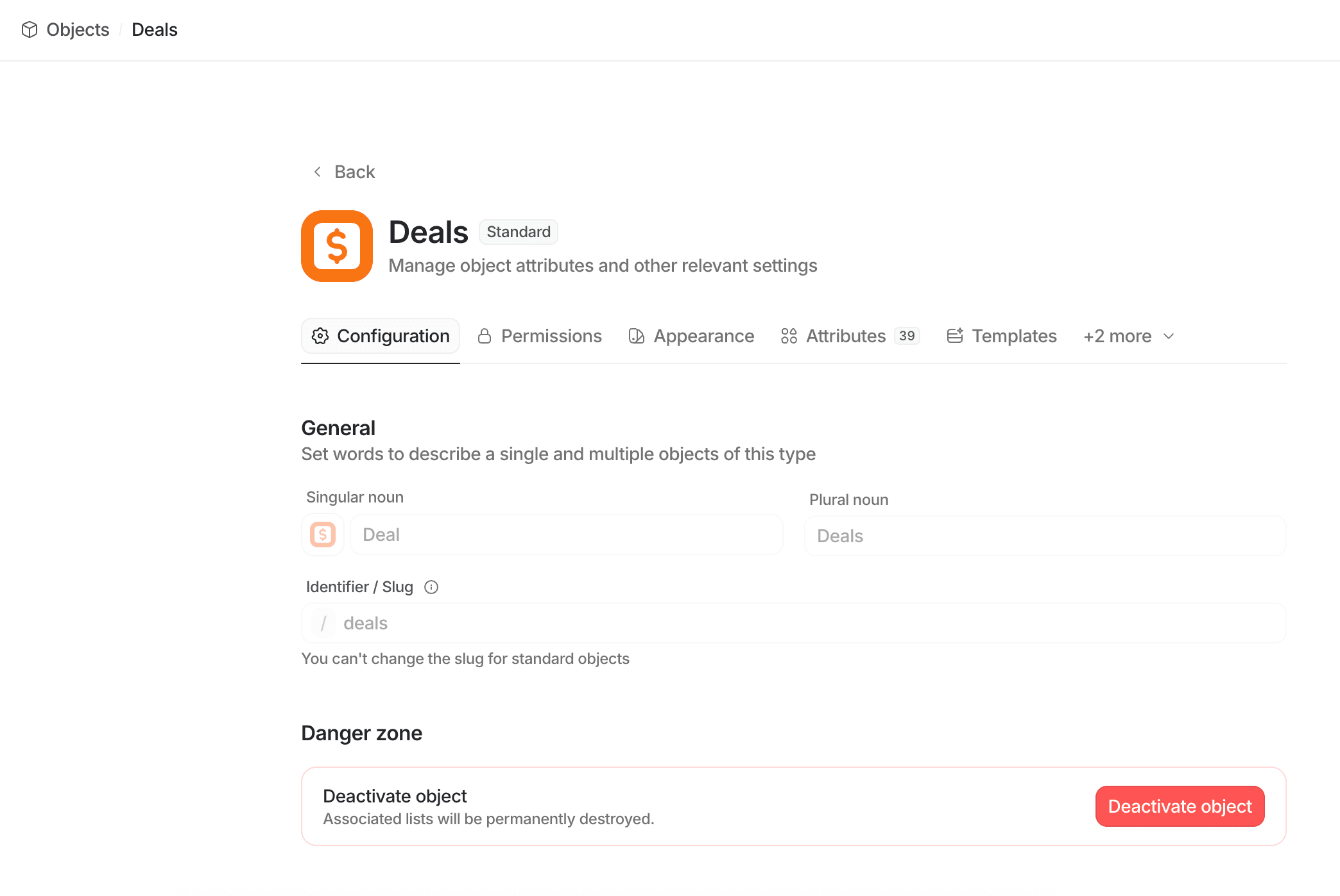 Standard objects are built-in objects provided by Attio. Because Attio understands the purpose of these objects, each one comes with a predefined set of attributes. Some are enabled by default, while others can be enabled as needed based on your use case. Standard objects include Companies, People, Deals, Users, and Workspaces. Admins and members with Full access to an object can configure access to objects.