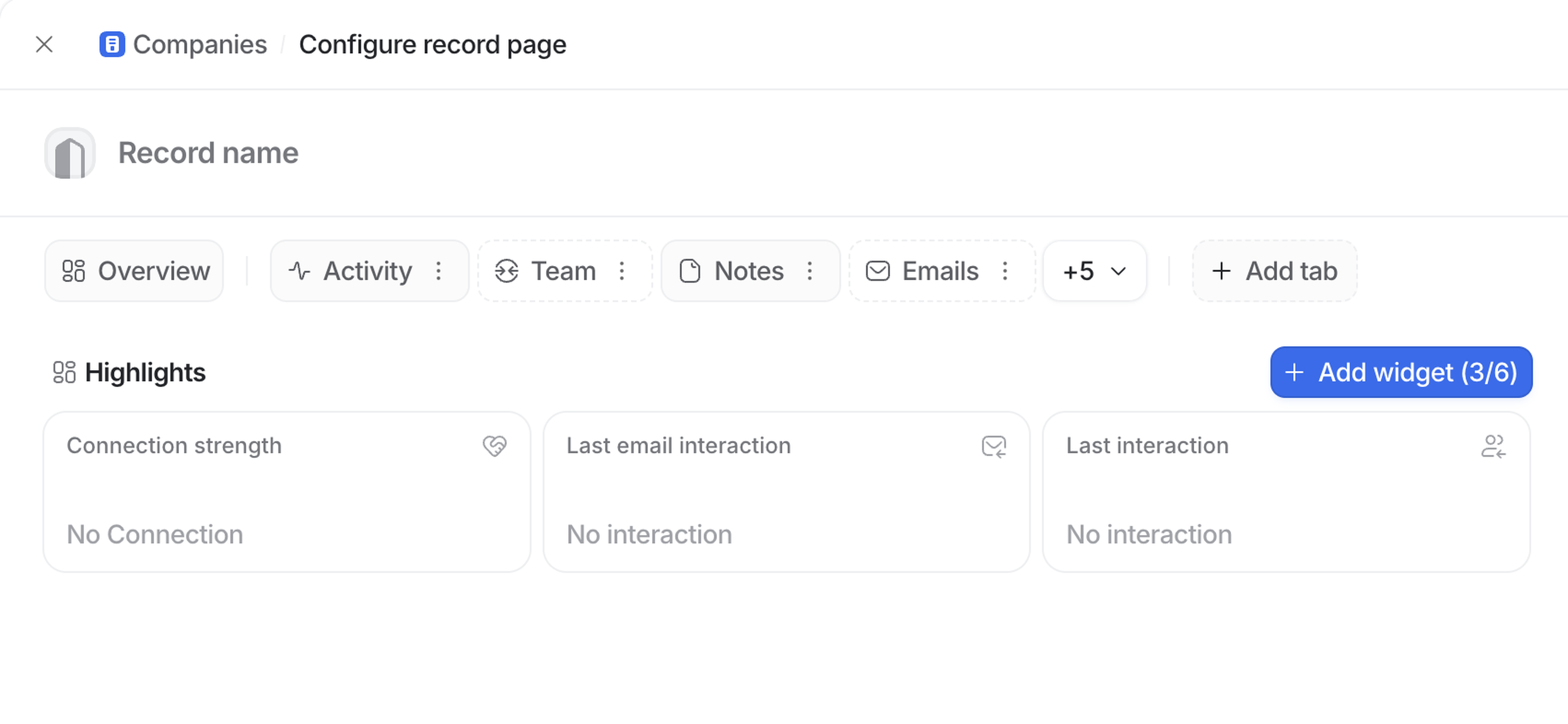 Configuration settings are unique to each object, meaning you can configure all company record pages to show certain information, then configure person record pages to show different information, and so on for each object. Changes admins make to record page configurations will be applied for all workspace members.