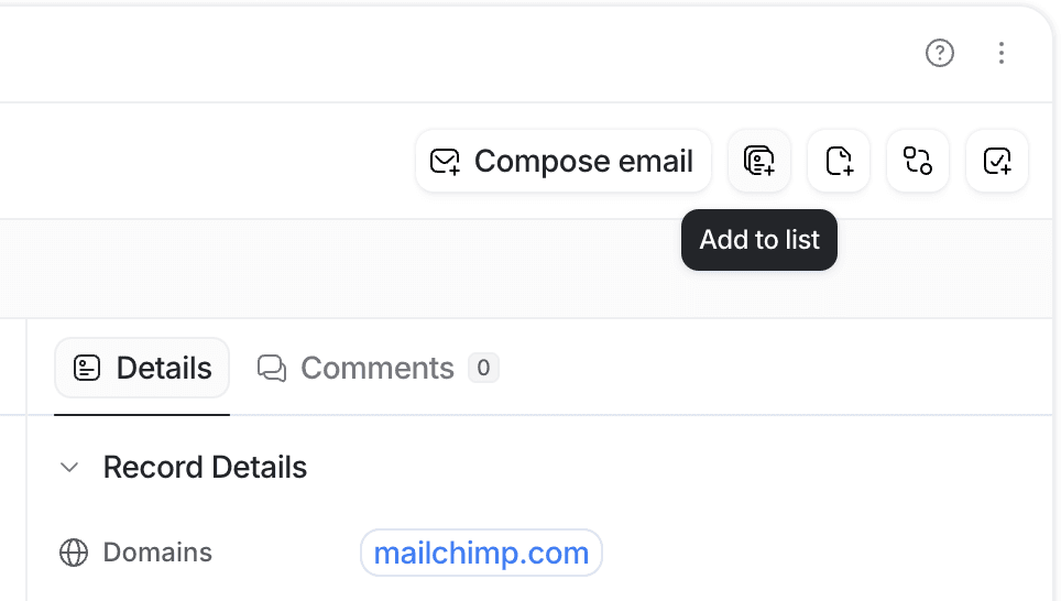 To quickly add a record to a list from a record page, use the keyboard shortcut e and select the list you want to add it to. Or, click Add to list icon in the top right corner of the record page.