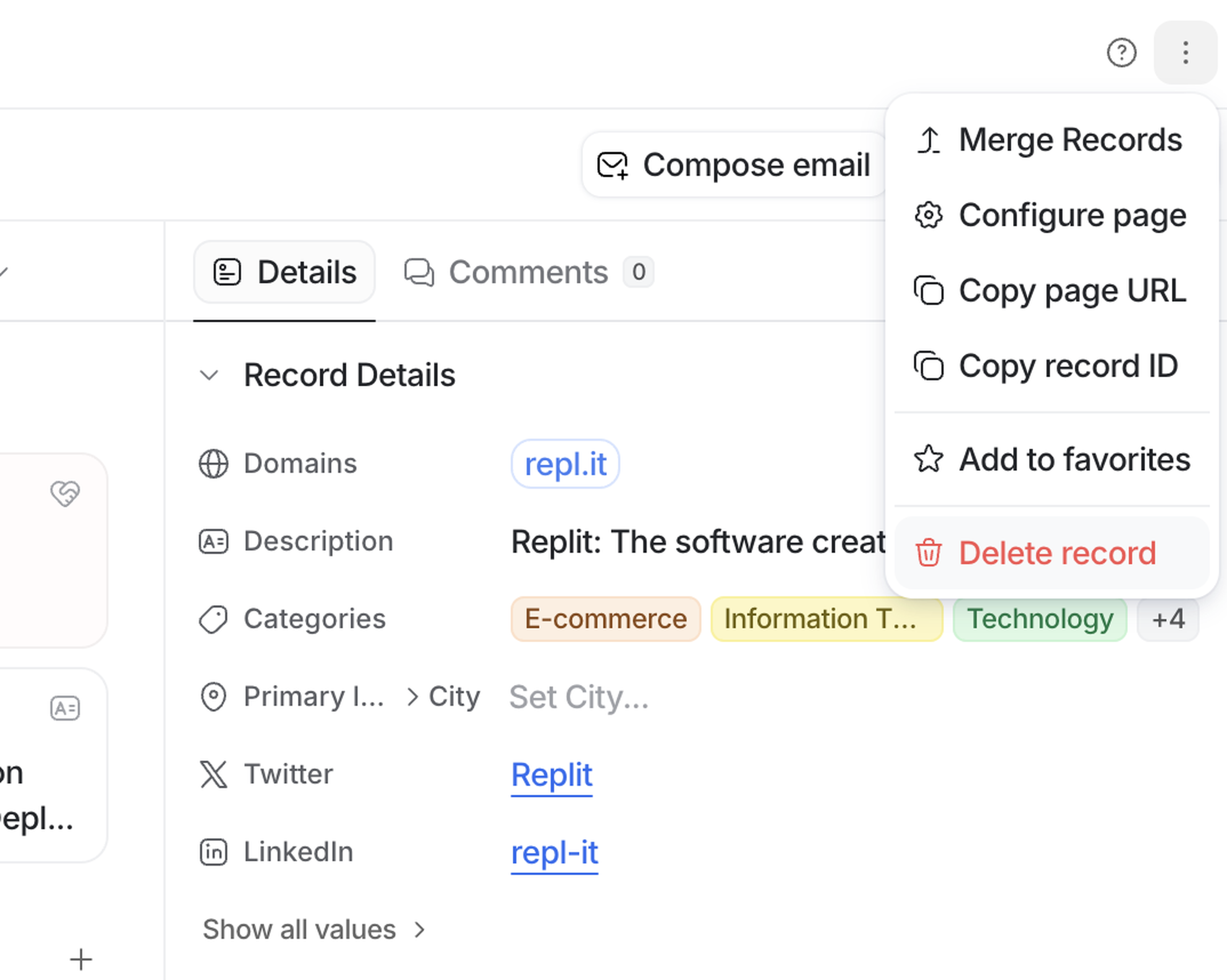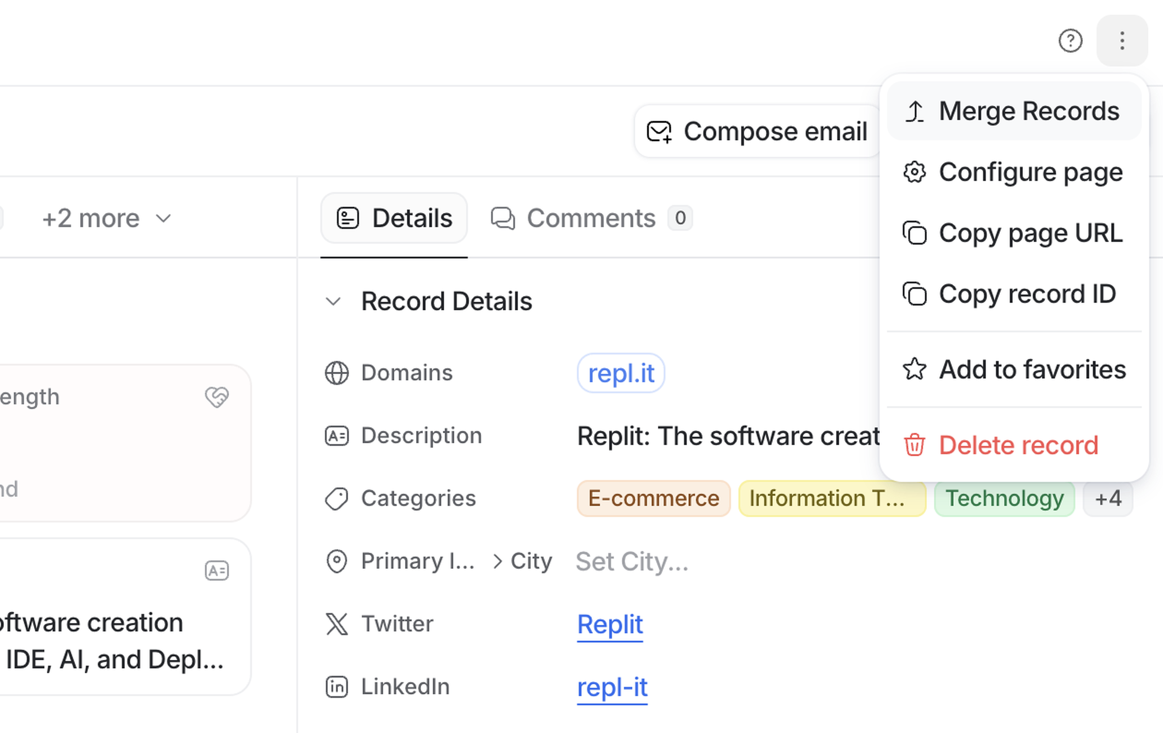 Attio's merge feature helps you clean up and de-duplicate records, merging them into one record. You'll be prompted to merge any duplicates when Attio detects them using domain for companies and email address for people.