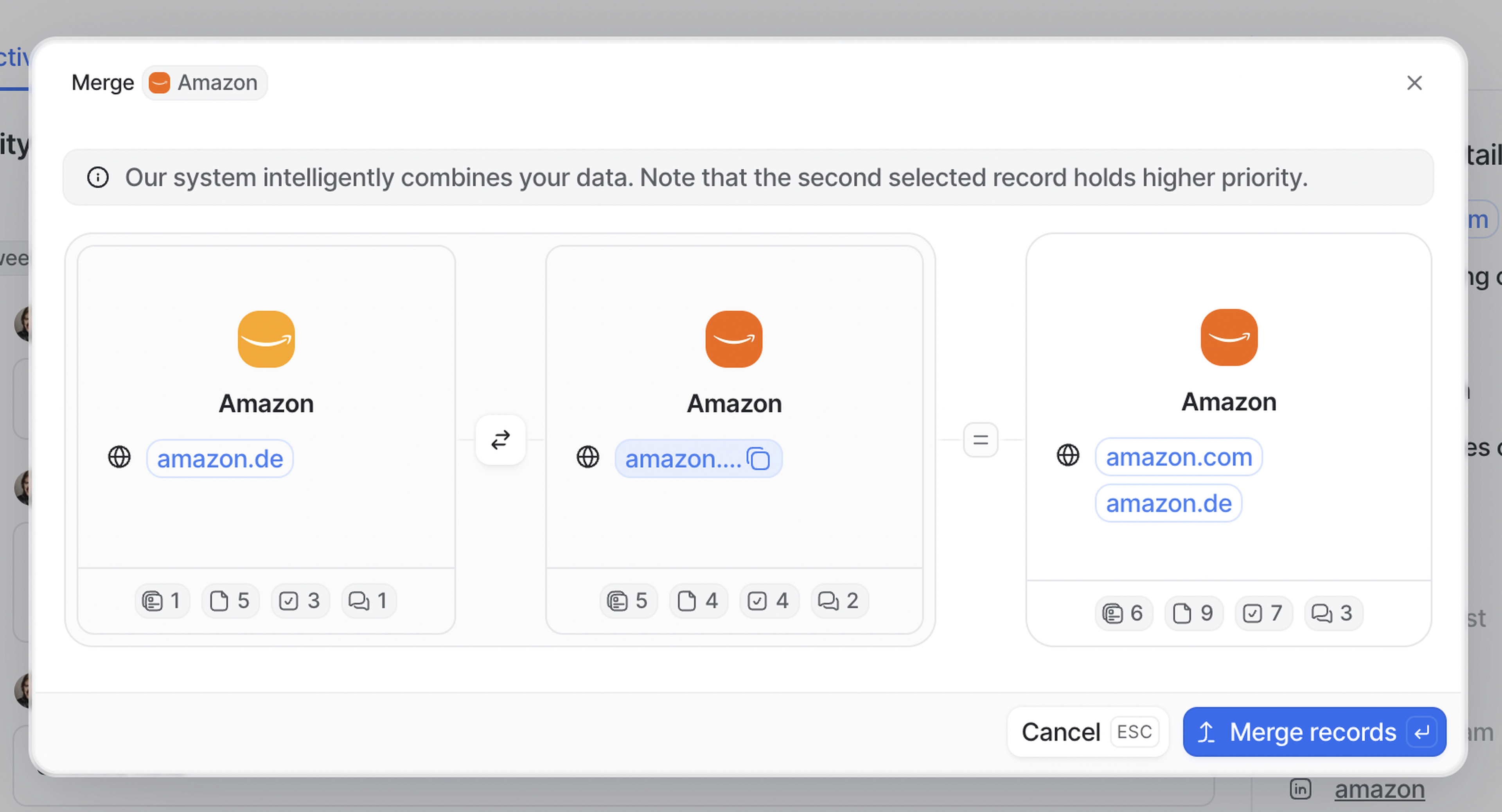 Note: It's not yet possible to merge records for Deals, Workspaces, Users, or custom objects.