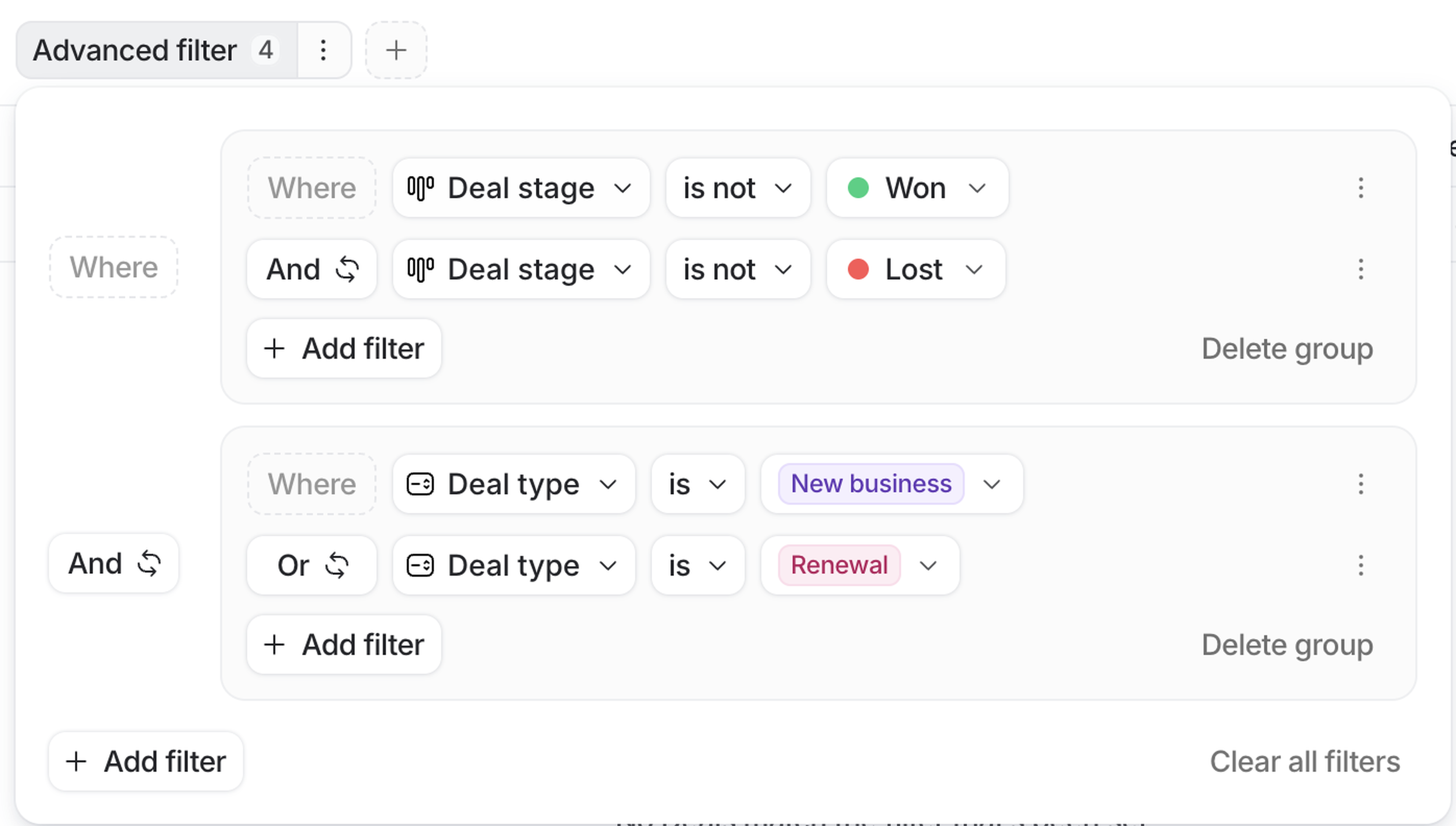 To remove a filter condition, select the ⋮ icon to the right of it, then click Delete filter.