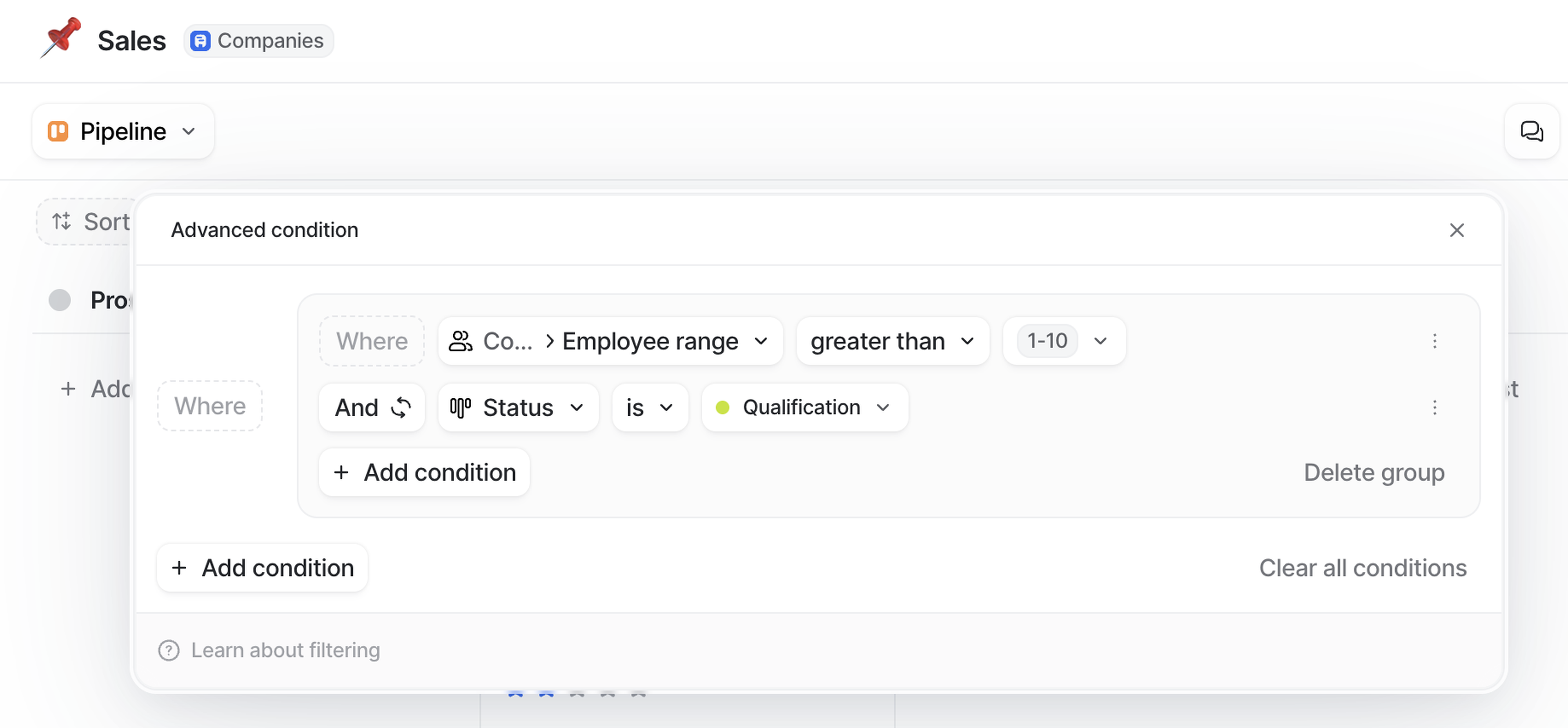 Filter and sort settings let you narrow and organize data in your table and kanban views. Saving these settings per view allows you to quickly surface different segments of your pipeline or records.