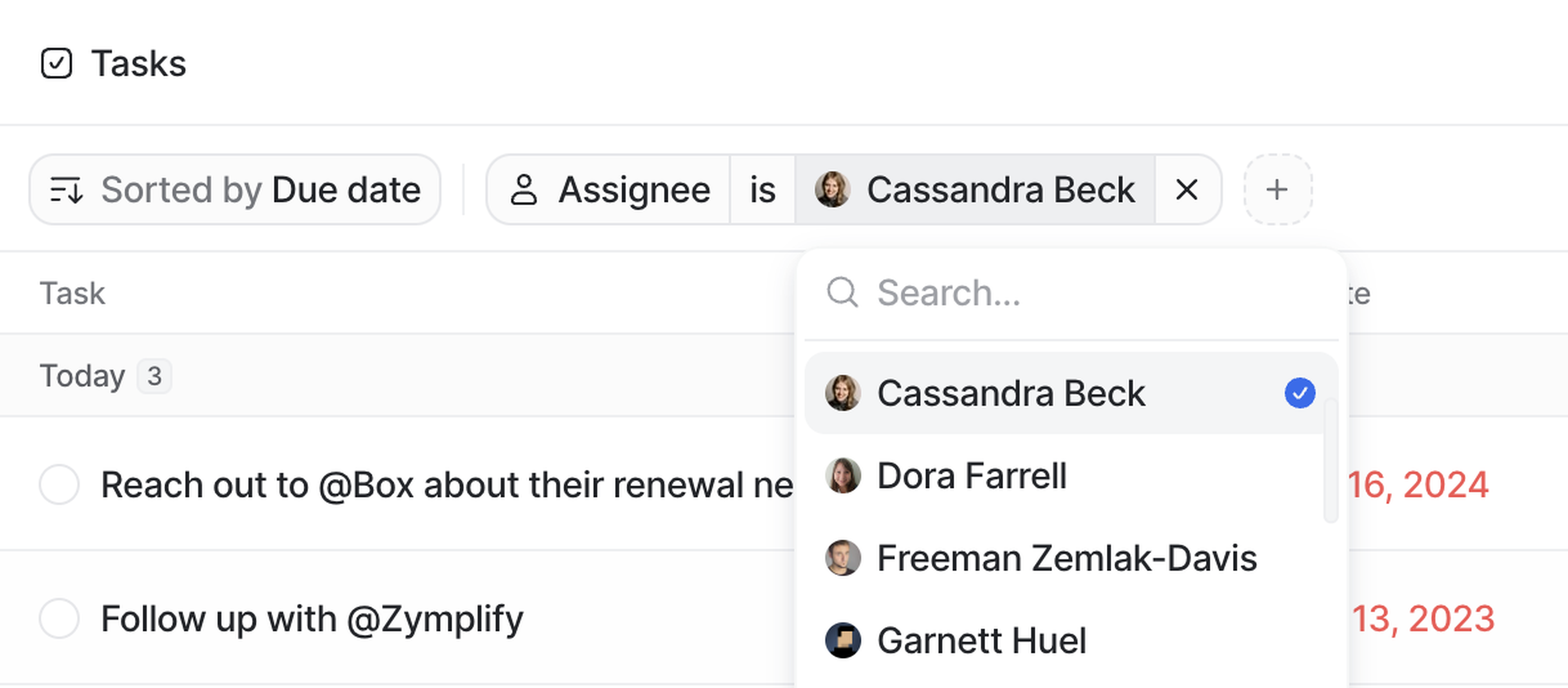 The Tasks page accessed from your sidebar hosts all tasks from across your workspace. Sort by either due date or assignee by selecting Sorted by, then the option, then Ascending or Descending. You can also filter tasks by a specific assignee by clicking Filter, Assignee, then is or is not, and the user. Click the X to remove a filter.