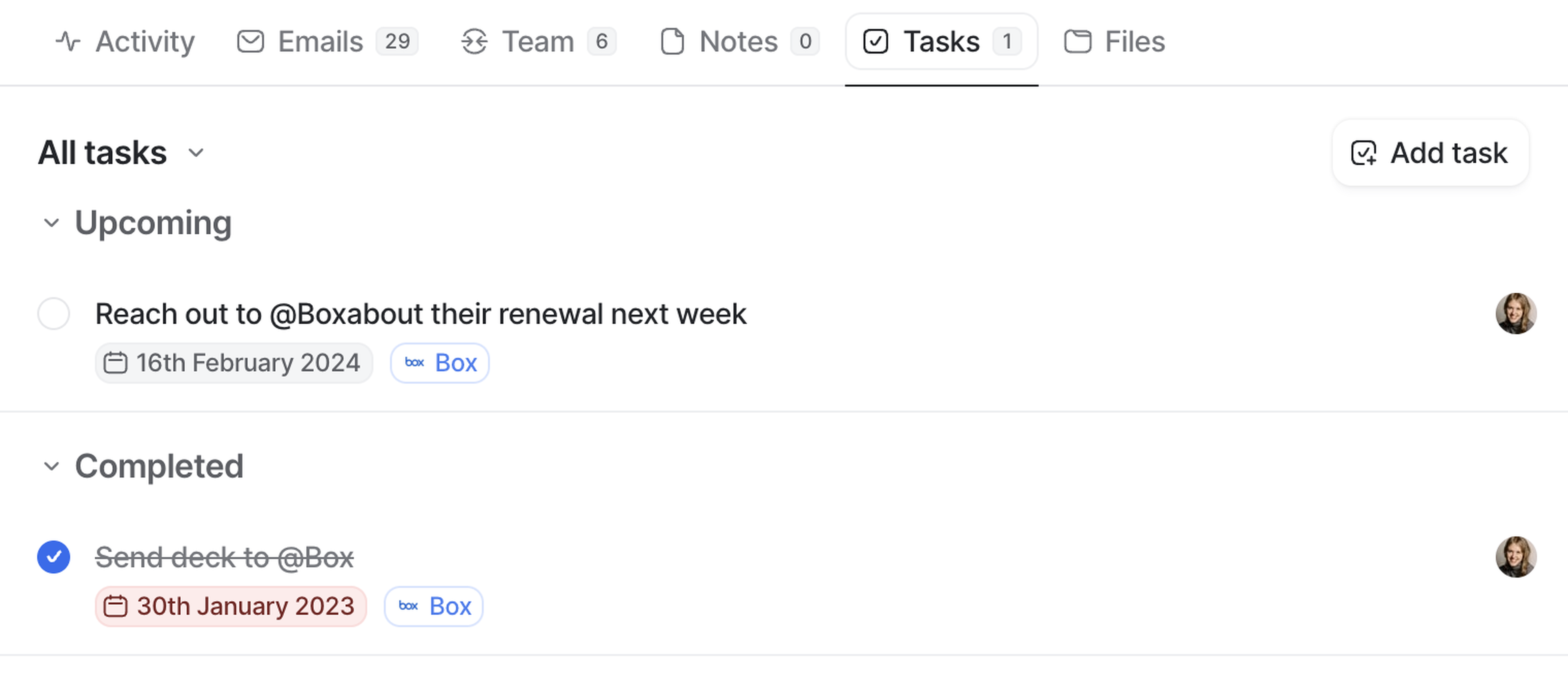 Each of your records also has a dedicated Tasks tab on their record page. You can manage and create new tasks here too.
