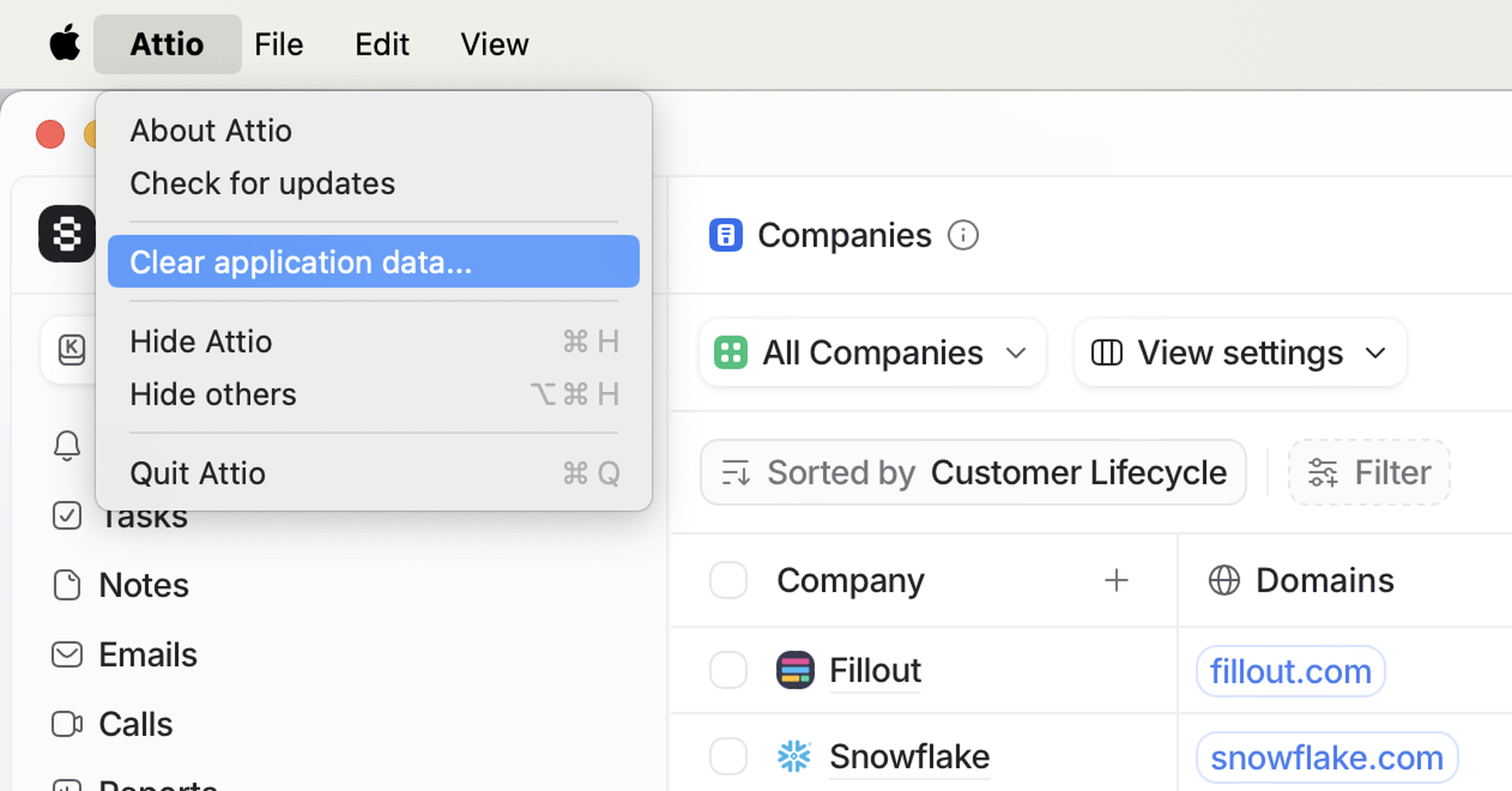 4. Clear application data by going to Attio, then Clear application data. This resets the Attio desktop app to a fresh state, like a clean install, without deleting your actual workspace data. Clearing application data can: