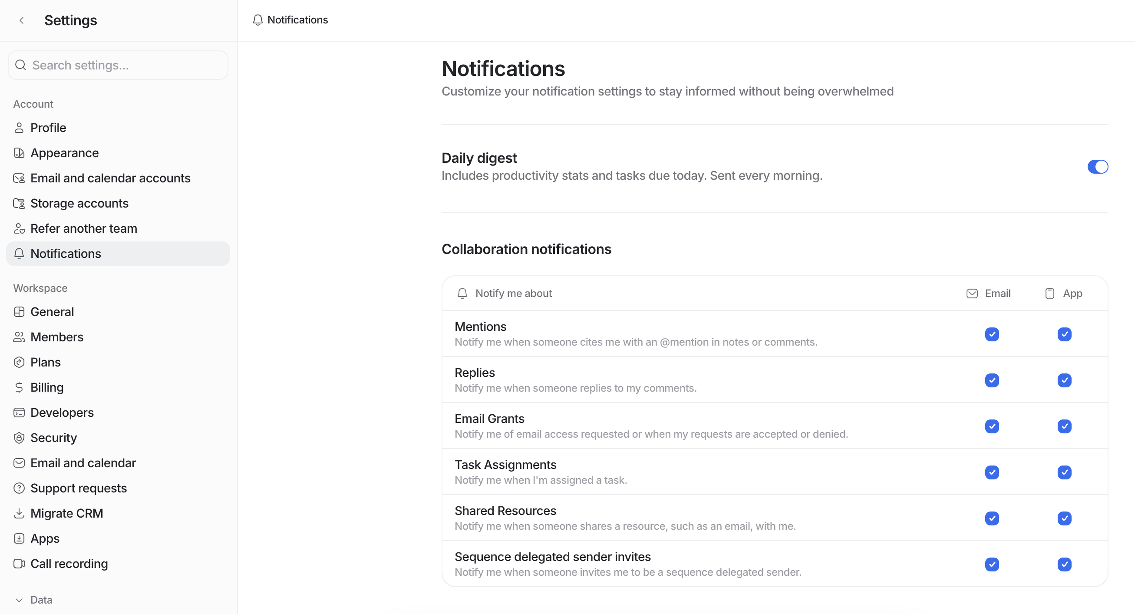 Receive notifications about mentions, replies to your comments, access requests and access grants for emails, new tasks assigned to you, and invites to be a delegated sender for sequences.