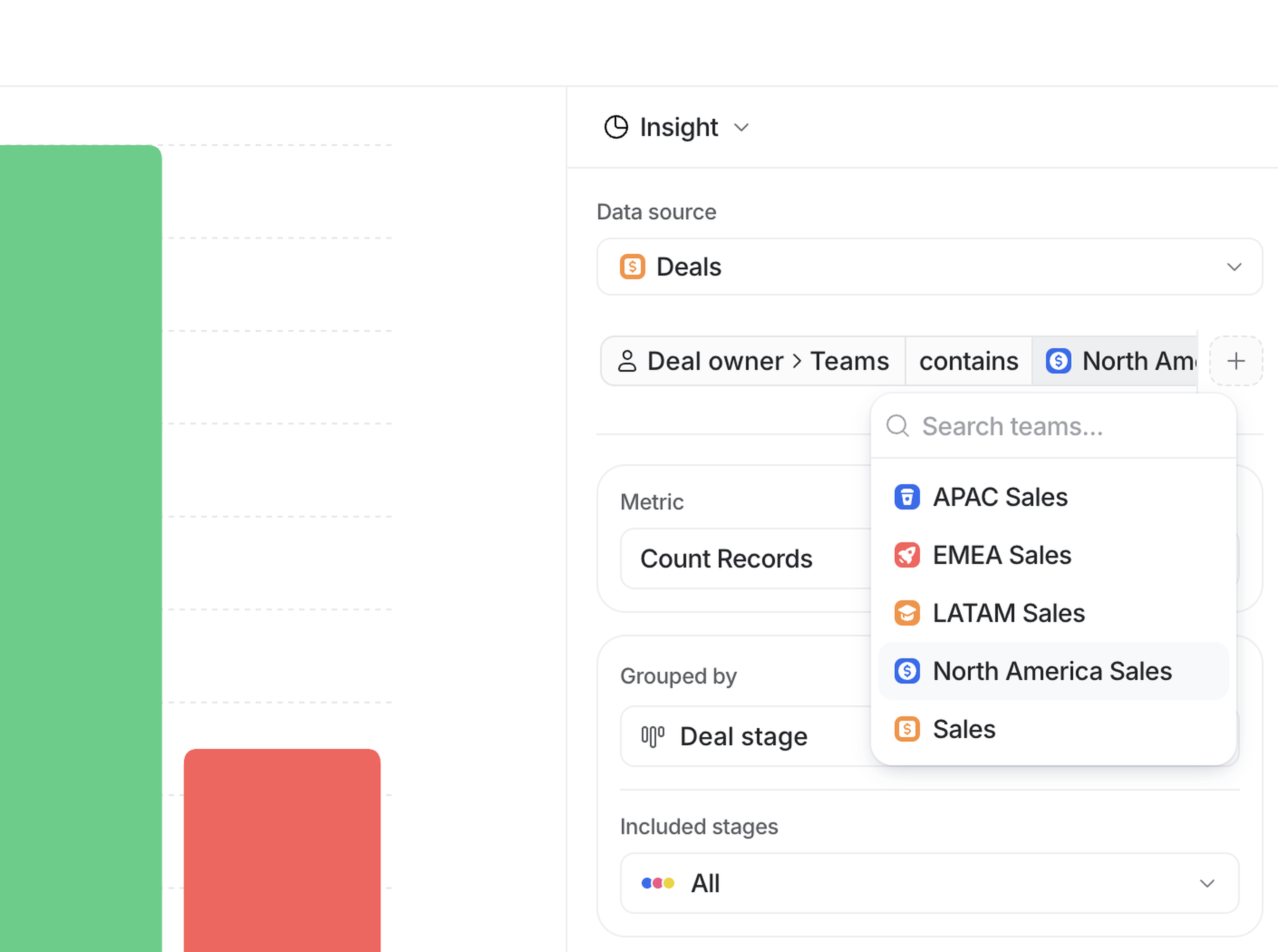 You can use teams in filters on record and list views, reports, the Calls page, and in workflow blocks by following these steps when adding a filter condition: